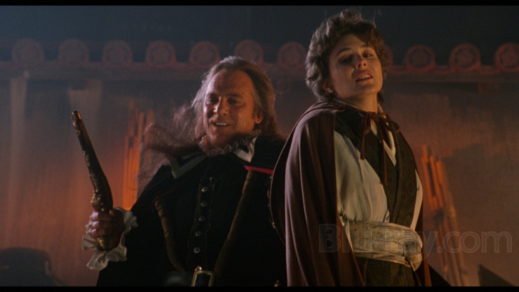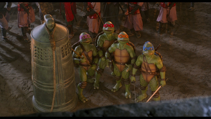 Teenage Mutant Ninja Turtles III is presented in its original aspect ratio of 1.85:1 with stereo and a new Dolby Atmos mix. The film is presented in 4K resolution in HDR10 and Dolby Vision.Of the two films in this set struck from interpositives, Teenage Mutant Ninja Turtles III fares better than its immediate predecessor in both its 1080 and 4K presentations, and I'd argue part of that success is due to a much more consistently tight resolution of grain in both formats, but probably more commendably in this 4K UHD edition. Yes, things can occasionally get thick and even slightly splotchy, but just looking at the nicely organic look of things in the red drenched opening scene provides a good beginning example of improvements on tap this time out. Speaking of those reds, the HDR / Dolby Vision grades in this film are especially appealing, and there are numerous examples of interesting highlights throughout, in both "time frames" employed. Some of the reds in the historical costumes, for example, are a bit more crimson tinged now than in the 1080 version. Yellows and greens are also repeatedly impressive throughout, and some of the outdoor location footage (shot in my home state of Oregon in what on the commentary track director Stuart Gillard calls Goonies territory, by which he assumedly means Astoria) is really evocatively hued. Detail levels enjoy at least marginal upticks from already excellent 1080 levels, and the frequent use of extreme close-ups for (human) faces provides really precise renderings of everything from skin pores to flyaway hairs. My 4K score is 4.25.