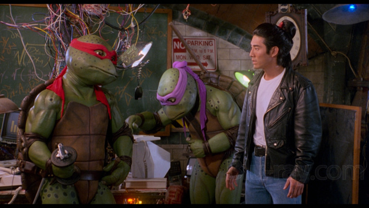 Teenage Mutant Ninja Turtles III features LPCM 2.0 and DTS-HD Master Audio 5.1 tracks. Kind of interestingly, I didn't sense the same noticeable enhancement of scoring and effects in the surround version on this film that I did with the second, though that's not to say there aren't differences, as the surround track does offer both decent if not overwhelming immersive aspects to the music, and also clear if intermittent discrete channelization of various sound effects. One way or the other, as with the two preceding films, my hunch is purists will want to stick with the stereo track, which provides great fidelity and clarity. Dialogue is rendered cleanly and clearly throughout. Optional English subtitles are available.
