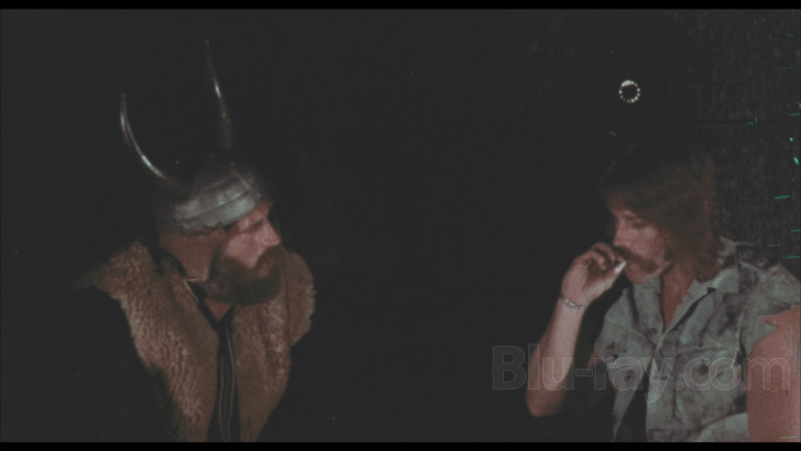 The image presentation (1.85:1 aspect ratio) for "The Black Six" is listed as "preserved from a 35mm print." Wear and tear is consistent throughout the viewing experience, maintaining a steady display of scratches, reel changes, and missing frames. Color is aged, dealing with intense fade for the most part, keeping hues mostly flat and reddish. Some skin tones approach normality, along with greenery and signage. Detail isn't strong, but a general sense of skin particulars is available, along with biker gang costuming selections. Rural distances are passable. Blacks are milky, lacking depth.