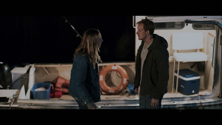 Block Island Sound features a 2160p 4K image that's wholly faithful to cinematographer Alan Gwizdowski's intentions and the McManus's vision of horror on the open sea. The film gets dark, very dark, but delineation doesn't falter, allowing the shadows to serve the unease rather than limit it. Clarity remains excellent throughout regardless of whether the sun is high or set, boasting crisp, clean edge definition and exacting fine detail and textures. Take one look at the hairs of Tom's red mane, the wrinkles creasing his face, the bulging veins beneath his skin, the heavy textiles of his sea- clothes and tell me I'm wrong. Colors, meanwhile, are cold but exceedingly natural, with vivid hues punctuating the wintry seas and shores, bold primaries splashing into view when called upon, black levels that are deep and unnerving, and contrast is consistently satisfying. I also didn't catch sight of any compression artifacts, macroblocking, banding, errant noise or other issues that might have mucked up the proceedings. This is low-budget horror with a high-quality digital transfer. Other than aesthetic choices, you won't find much to complain about here.