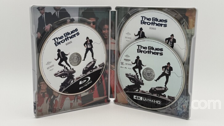In time for its 45th anniversary, the classic musical-comedy 'The Blues Brothers' returns to 4K UHD disc in this 'The Blues Brothers: Limited Edition SteelBook 4K' courtesy of Universal. The film stars comedy legends Dan Aykroyd and John Belushi who are joined by a host of other well-known actors and musicians. The new SteelBook is also distinguished by the addition of a Blu-ray disc that contains a new on-disc supplemental feature entitled "On a Mission From God: The Story of The Blues Brothers". A Blu-ray disc which is identical to the original release from 2011, and a Digital Code redeemable via Movies Anywhere are also included. Please scroll down to the 'Special Features and Extras' section below for a discussion of the new SteelBook, and the new on-disc supplemental feature.