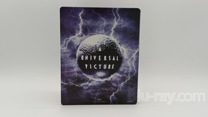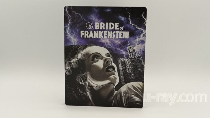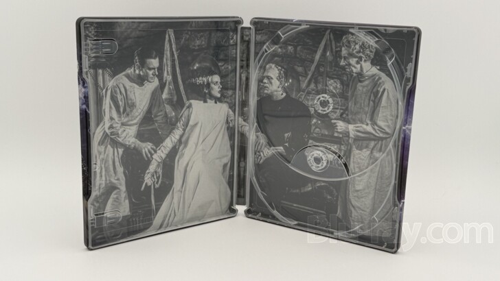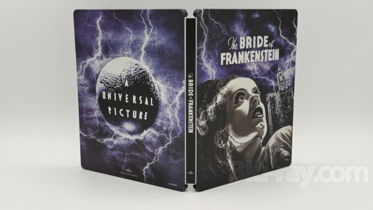 The design of the new SteelBook wisely opts to focus on the single most identifiable element from The Bride of Frankenstein - Elsa Lanchester and her striking profile and the eye-catching white streak of hair that accentuates cinema's most well-known hairstyle. Rendered in black-and-white, Lanchester's Bride dominates the lower half the cover. Over her shoulder, one bolt from the lightning-filled sky finds its way to the elaborate lightning rod that sits atop a stony tower. The film's title is found centered above them. The sky itself is an ominous mix of various shades of deep purple that helps to make the lightning come alive. The spine is a simple black field with the film's logo in the center and printed in the same font as is used on the cover. Universal's current logo is found at the bottom. The back cover, instead of using a still from the film, elects to use a 1930s vintage Universal logo as the main image. The deep purple color scheme carries over here, and, like the cover, the image is electrified by a massive lightning storm, with several huge bolts striking the earth over which the words "A Universal Picture" are displayed. Universal's current logo is found centered at the bottom while a product number sits in the lower right corner. Opening the SteelBook, the Digital Code rests under the two tabs on the left side. On the right side, the 4K UHD disc and the Blu-ray disc are stagger-stacked, each on its own hub, with the 4K UHD disc on top. Removing the discs and the Digital Code reveals a black-and-white two-panel image of Lanchester's Bride meeting Karloff's Monster. The two creations are flanked by Colin Clive's Henry Frankenstein and Ernest Thesiger's eccentric Doctor Pretorius. The SteelBook has been given a matte finish which should do an excellent job resisting fingerprints associated with normal handling, even as it draws attention the lightning when held at a certain angle in the right light. The SteelBook does not contain any embossed or debossed elements. It's a striking SteelBook.