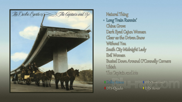 The Captain and Me features Dolby Atmos, DTS-HD Master Audio 5.1, DTS-HD Master Audio 4.0 and DTS-HD Master Audio 2.0 options, and there are some manifest differences between them. For some of my thoughts on the Quadio version, my The Doobie Brothers: Quadio Boxed Set Blu-ray review has some specific mentions of various songs on this album and their multichannel presentation in that format. To cite just one of a really large number of potential examples, though, that "burst of backup vocals" I mention in the four channel version of China Grove is considerably less discretely channeled in the Atmos mix, where the backups tend to waft as a kind of amorphous mass emanating from several channels simultaneously. Similarly all sorts of differences accrue in terms of where guitars and percussion in particular are positioned, though the biggest differences to me were between the 4.0 and Atmos versions, with the 5.1 version striking me as actually more similar to the Quadio version than the Atmos. Vocals are all beautifully mixed and the layering in all of the multichannel outings is superb, but so distinctly different at times that I heartily recommend fans of the album listen to each of the codecs, either in succession or by toggling between them.