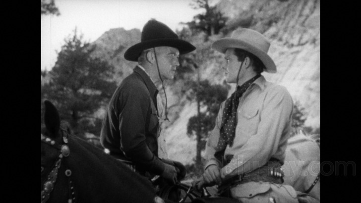 Very little film material exists for The Eagle's Brood, with reel 4 being the only extant 35mm elements in this second entry of the Hopalong Cassidy series.This is another heroic restoration effort by ClassicFlix, but as is probably clear from the above verbiage, there are some pretty wide quality variances here between the 35mm and 16mm material (I've included screenshots from both stocks so that those interested can see some of the differences). The 35mm material looks largely fantastic, probably especially when stacked up against the unavoidably less lustrous looking 16mm sections. While clarity and detail are obviously better on the 35mm source, the 16mm material still looks at least relatively decent, though fine detail is less fulsome and all of the 16mm material understandably has more of a "dupey" look with less pleasing contrast. As is mentioned overtly in ClassicFlix's text introduction, there's some noticeable damage still extant in the 16mm material. The 35mm reel is the equivalent quality of Hop-a-Long Cassidy.