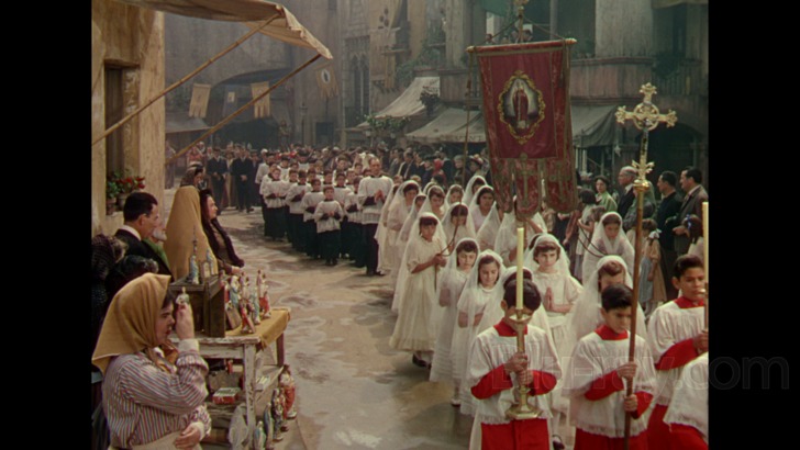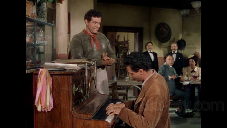 Not surprisingly, Mario Lanza's powerhouse vocals are at the forefront of Warner Archive DTS-HD 2.0 Master Audio mix, a split mono presentation that features a strong dynamic range and almost zero source defects. Although, yes, some of the lyrics are questionably lip-synced, it's a mostly convincing illusion bolstered by Lanza's real-life operatic chops and, along with supporting musical performances (by the likes of Dorothy Kirsten, Ann Blyth, Blanche Thebom, Teresa Celli, Giuseppe Valdengo, Marina Koshetz, and Nicola Mosconam) and the original score by Johnny Green, forms a satisfying soundstage that's given plenty of time to shine. Dialogue is crisp and clear with no drop-outs or distortion, save for one stray moment of sulking by young Enrico (Peter Edward Price) during the film's first ten minutes.