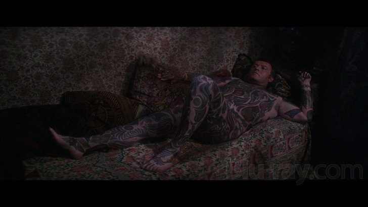 The Illustrated Man was shot in anamorphic Panavision by Philip Lathrop (Earthquake and The Americanization of Emily). For this 1080p, AVC-encoded Blu-ray from the Warner Archive Collection, a recent interpositive was scanned at 2K by Warner's Motion Picture Imaging facility, followed by color-correction using a dye-transfer Technicolor print as a reference. After WAC's typically thorough clean-up to eliminate dust, scratches and age-related wear, the resulting image is impressively detailed and vibrantly colorful, effectively rendering the film's diverse settings, which vary from the richly dark decor of Felicia's den to the sterile future depicted in Willie's visions. Day-for-night sequences exhibit the fall-off in detail that is typical of that process, and scenes set in the future are distinguished by softening with diffusion and colors that are deliberately odd and unnatural. The grain pattern is finely resolved, and the image is free of artifacts or distortion (other than the unavoidable side effects of optical superimposition, e.g., during the title sequence). WAC has mastered The Illustrated Man at its usual high bitrate of just under 35 Mbps.