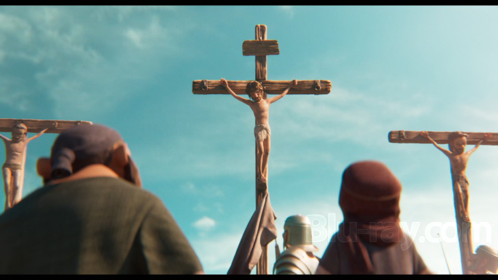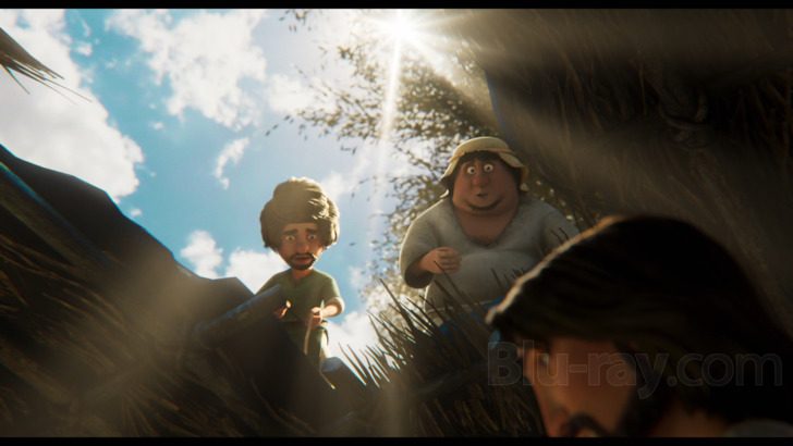 The 1080p picture presentation is solid. I can't describe it as "perfect," and I can't describe it as "middling" or "poor." "Solid" captures it well. It looks good, with some drawbacks. Generally speaking, the picture delivers a fine 1080p image, capturing the fine points of the animation with excellent clarity, ranging from human facial details to cat fur and including all sorts of sharp, accurate imagery in nonliving elements as well, like the wooden stage in the opening moments and the wood that makes up the cross towards the end. While not the richest or sharpest content on Blu-ray, the imagery here sufficiently captures the detail inherent to the animation, albeit with some softer elements in view throughout. Color are not overtly brilliant; this can often be a fairly drab film, with some excellent bursts of color (the opening shot showing Adam and Eve). But for the most part, the scenes during Jesus' life are predominantly earthen, albeit with good variation and accuracy, especially soaked in daylight. Rich blue skies, deep blue waters, and some lush natural greens are probably the standout colors (see around the 32-minute mark foe a great example of all three). However, there are some drawbacks. Compression issues are in evidence. Snowy noise permeates the film. Small examples of aliasing are visible from time to time. These are distracting, but even still the image looks "solid" on the whole.