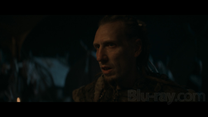 It should come as no surprise to viewers who have followed Uhtred's adventures since the beginning that the series' blue-grey color palette is brought to film as well, and it's just as dominant here as it ever was. This is a world where grey armor, brown leather and fur, and tan tunics are in abundance and bold primaries are in short supply. The impact of this color choice is to create the series' signature aged look, produced in accordance with the colors generated from the types of dyes likely employed at the time. Detail levels are pleasingly high and are most easily noticed and enjoyed when examining battle-tested chain mail where every nick and dent in every interlocking ring is visible, and the furs worn by the Danes which present with an authentic texture. Coarser rough-spun garments won by the priests and common folk also yield an almost tactile quality, and environmental particulars in stonework, thatched rooves, and the wooden walls of Bebbanburg also dazzle in their rustic way. Black levels are inky with much detail visible in even the darkest of scenes, and skin tones are healthy.