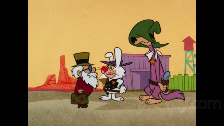 "Ideal" is right. These 23 multi-part episodes have absolutely never looked better -- not on DVD, not on TV, and probably not even in a studio screening room back in the mid-1960s. Simply put, The Magilla Gorilla Show has been lovingly polished to a showroom shine on this three-disc Blu-ray set, whose new and exclusive 1080p transfers have been sourced from new 4K scans of the original camera negatives*. As usual, a generous amount of careful manual cleanup has been applied here, though film grain remains intact and occasional "natural" defects like cel dirt have been left undisturbed. Fine detail and color representation are both exceptional from start to finish, as the classic H-B house style really gets a chance to shine in all its sturdy but simplistic glory. Disc encoding is very good as well: the bit rate doesn't run quite as high as most of Warner Archive's catalog film releases but, given the show's flat color palette and 1.33:1 aspect ratio, it's more than enough and I wasn't able to spot any obvious compression-related issues such as banding, posterization, or macro blocking. For these reasons and more, Magilla earn a full five stars as the boutique label continues to set a high bar for what classic animation should look like on Blu-ray.