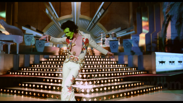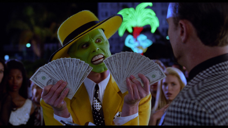 The Mask has been restored by Arrow Films and is presented in its original aspect ratio of 1.85:1 with 5.1 and stereo audio, plus a new Dolby Atmos mix exclusive to the UHD presentation.To quote a certain memorable line from the film, The Mask in 4K UHD is indeed sssssmmmmokin', though rather interestingly the HDR / Dolby Vision grades may actually tend to point out the relative blandness of a lot of the "normal" (i.e., non-Mask) vignettes in the film, as in a lot of either the bank or apartment material with Stanley, where a reliance on frankly kind of brown tones tends to predominate. The increased dynamic range of this 4K UHD presentation does show its stuff throughout, though, in many of the effects or at least effects adjacent scenes. To cite just one very noticeable example, the bridge scene where Stanley's car clunks out and he discovers the mask has a really elegant cobalt blue to purple look in this 4K version that doesn't have quite the pop in the completely excellent 1080 version. What's even better, at least in terms of this particular scene, is the glut of mist which when combined with that blue-purple hue and grain might have led to compression issues which are commendably absent here (and throughout the presentation). Other HDR standouts are of course the green of Stanley's mask laden face, as well as some of the lighting choices in the club that becomes a major location and site of a couple of the film's outstanding set pieces. Detail levels see some upticks from already impressive 1080 levels, especially in some of the close-ups, where the mask effects can show their seams. Fine detail on all of the practical sets and costumes is excellent.