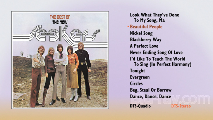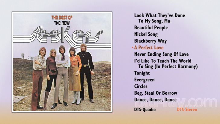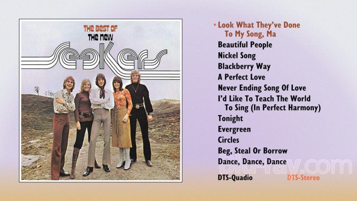 The Best of the New Seekers features DTS-HD Master Audio 4.0 and DTS-HD Master Audio 2.0 options. The quadraphonic mix is both wonderfully spacious but also what might be termed an immersive wall(s) of sound album where massed voices and instruments tend to surround the listener from all sides. There's an undeniable "middle of the road" or "easy listening" gloss to many of the arrangements which may not be to everyone's taste, but instrumentation sounds bright and clear (there's some especially nice separation between guitars and percussion) and vocals are typically nicely warm and well prioritized.