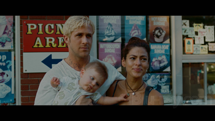 TPBtP was recorded and mixed in Dolby Digital 5.1. Shout has supplied a DTS-HD Master Audio 5.1 Surround track (3883 kbps, 24-bit) and a DTS-HD Master Audio 2.0 Stereo downmix (2033 kbps, 24-bit). (The average audio bitrate for the DTS-HD MA 5.1 mix on the Universal BD is marginally higher at 3909 kbps.) Cianfrance and his sound design team place the viewer in the middle of the amusement park during the main titles. Sounds are circular and completely enveloping. The viewer can really hear the motorcycle engines when Luke and two others rev them up inside a steel cage's "globe of death." There's also a loud rush when Luke rides his motorbike through congested traffic. There's also great directional f/x when Luke lifts up a garage door to Robin's (Ben Mendelsohn) shop. Spoken words are generally legible. It should be noted that Ryan Gosling and Eva Mendes sometime mumble their lines and speak in lower tones that can be a little hard to discern. The surround channels deliver excellent ambiance in the traveling circus and forest scenes. One can hear crickets and cicadas.