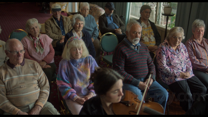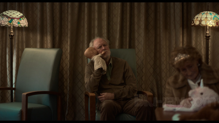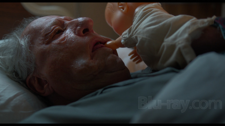 The image presentation (1.85:1 aspect ratio) for "The Rule of Jenny Pen" does score with detail, providing a clear look at rather incredible skin particulars on the aged cast, examining wrinkles and wear, and extreme pores on Rush. Roughness remains on physical displays, along with the wiry hair of the residents. Costuming, favoring sweaters and professional uniforms, stays fibrous. Textures are also preserved on meal service and living spaces, taking in decorative additions. Interiors around the senior care center are dimensional, exploring decorative additions and neighbors. Exteriors are limited but deep. Colors are alert, maintaining rich primaries on clothing choices and display items, achieving distinctness with gross food offerings as well, playing up the hellish experience of the senior care home. Dave's blue eyes and white hair are intense. Evening events provide big floods of greens and reds as lighting changes to a more malevolent atmosphere. Delineation is satisfactory. Compression is an issue during the viewing experience, as banding is periodic. Patches of blockiness are present as well.