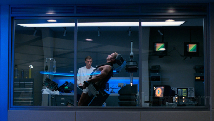 In his overwhelmingly positive 2022 review of the 4K Steelbook, my esteemed colleague Marty Liebman praised that disc's tightly organic grain structure, fine detail, and clean appearance, also noting several advancements achieved by its 2160p resolution and robust Dolby Vision HDR color grading. While this 1080p/SDR downscale obviously can't match the UHD in those latter departments as well as a few others, it unquestionably earns similar praise from yours truly for those base-level fundamentals and a format-high bit rate on this supportive dual-layered disc. The Running Man offers a visually engaging blend of dark and muted dystopian environments alongside its candy-colored game show set and costumes, with elemental effects like heavy fog, scorching flames, and crackling electricity holding up remarkably well for "just" high definition. Ignoring a few baked-in hiccups, this a disc that's dangerously close to format perfection; it only earns a half-point deduction for not preserving The Running Man's original 1.85:1 aspect ratio.