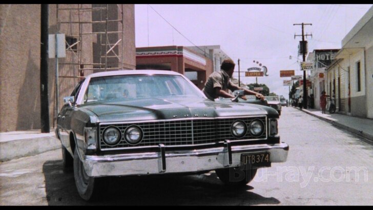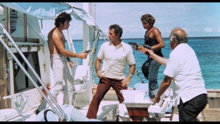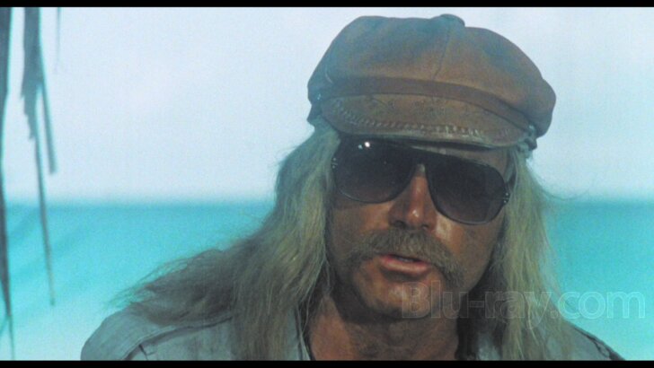 The current presentation of The Shark Hunter is a reconstruction job. According to Severin, it combines footage from two 35mm prints, both with obvious limitations introduced by aging. Despite several notable bumps and frame skips, visible scratches and marks, I found the reconstruction job to be very nicely done and pleasing. It is exactly what I expected, given the lack of proper elements. Unfortunately, the final product is very oddly graded. There is obvious tealing of the kind that plagues Criterion's recent 4K restorations of Night Moves and Sorcerer, creating similar or replicating the same anomalies that are present there. For example, numerous primaries are collapsed, while various ranges of supporting nuances are lost. The age of the 35mm prints is not a contributing factor. All of these anomalies have been introduced during the grading process. As a result, a lot of the color degradation creates wild, digitally looking visuals, like the ones seen here, here, and here. Unsurprisingly, even in the best-looking areas, balance is still off by a lot, and the dynamic range of the visuals remains problematic. (These particular anomalies are extremely similar to the ones seen on the recent, also compromised by tealing applications, 4K restoration of Convoy). There are no traces of problematic degraining, sharpening, or contrast boosting adjustments. Ultimately, I think that this release is a rare misfire for Severin Films because with a proper grading it easily could have been as satisfying as its recent releases of Rats: Night of Terror and Hell of the Living Dead, both sourced from challenging elements as well.