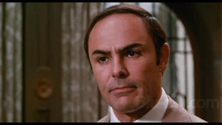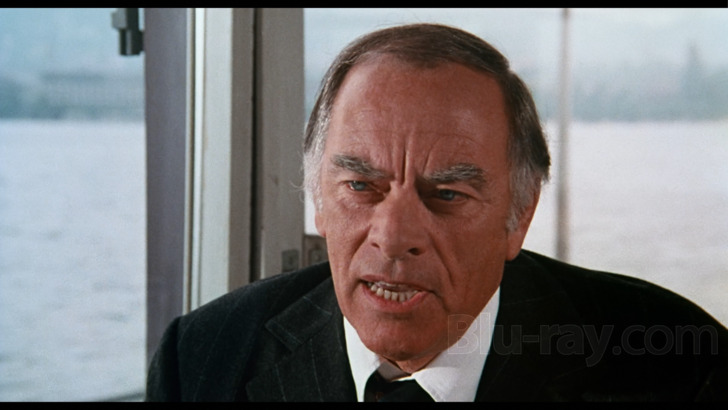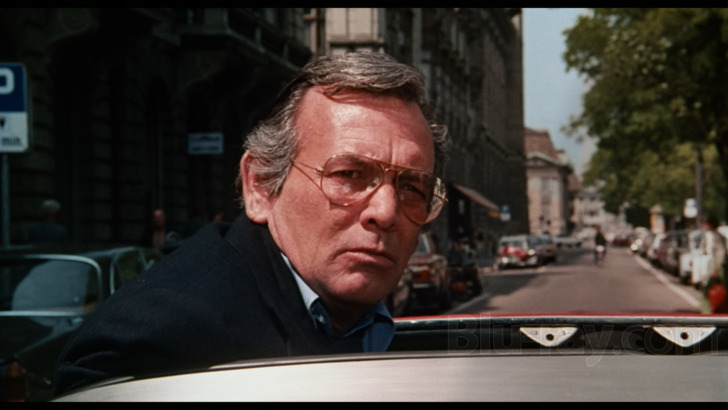 The Swiss Conspiracy is presented on Blu-ray courtesy of Film Masters with an AVC encoded 1080p transfer in 1.85:1. The front cover of this release advertises a "new 4K restoration from original 35mm archival elements", without specifying what elements those might have been. I frankly wish purveyors of home media would simply let us know what was used (interpositive? print?), but that curmudgeonly complaint aside, if the unrestored trailer is any indication of the shape the actual feature was in, the results here are pretty heroic, at least relatively speaking. There are some definite passing issues with color timing and contrast, but at its best this presentation offers a natural looking palette and some secure detail levels. That said, there are any number of temporary downturns in image quality, sometimes within the same shot, which may indicate a badly damaged source or one that wasn't curated especially carefully. While there is a noticeable grain field, it can pass into near invisibility at times, especially against some of the brighter outdoor backgrounds.