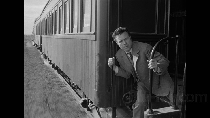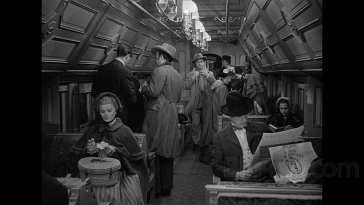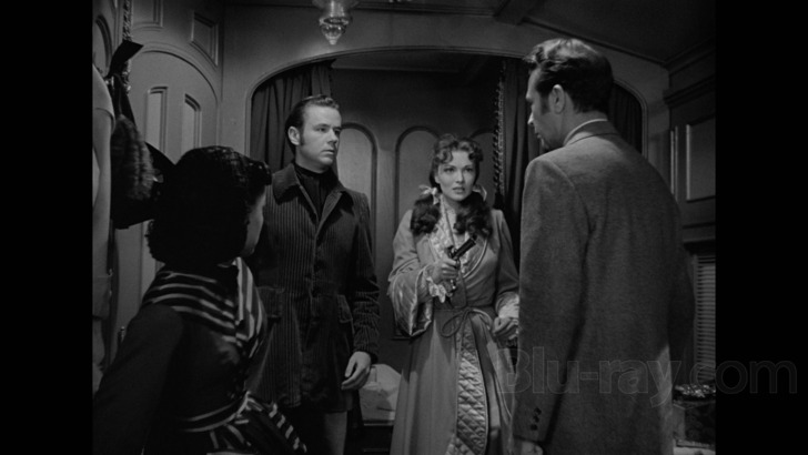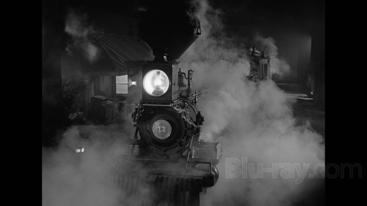 Warner Archive's new restoration of The Tall Target and its resulting 1080p/SDR transfer are advertised as being sourced from a new 4K scan of best-available preservation elements. This typically indicates a mixture of the original negative and at least one secondary source... but with no specifics available, it wouldn't be right to speculate. But as evidenced by these direct-from-disc screenshots, the film's noir-tinted cinematography is held together very tightly from start to finish, with the best-looking shots absolutely looking like they were pulled from first-generation nitrate elements treated with care. Fine detail, solid black levels, organic film grain -- all and more are accounted for during the majority of the film's lightweight 78-minute runtime, even difficult material like smoke-heavy shots of the train's exterior (above). Other segments don't look quite as good, from the obvious (the opening credits and station backdrop, which are much smoother due to opticals) to stray "dupey" looking shots and other sporadic dips into softer territory. Luckily the good far outweighs the bad here, which means that this new Blu-ray presentation of The Tall Target far exceeds previous home video editions and, for long-time fans, will be like seeing it for the first time.