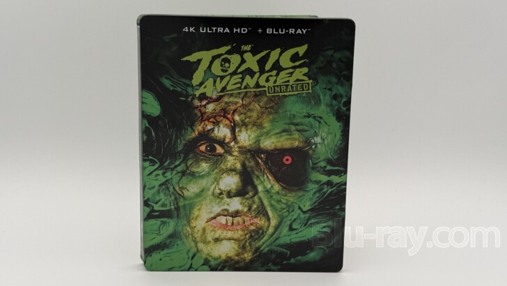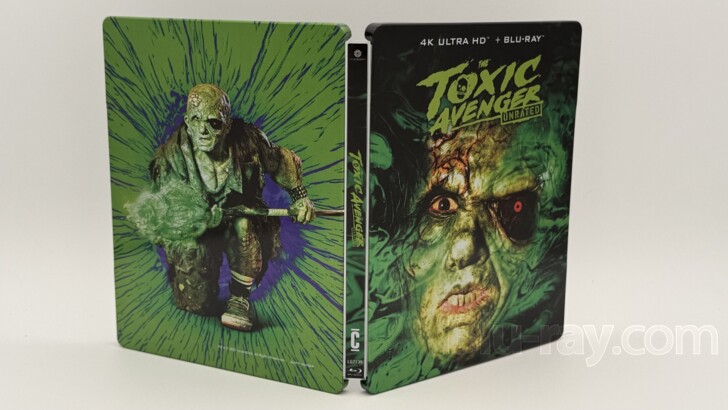 The Toxic Avenger SteelBook 4K (2023) arrives with a glossy slipcover that features both an embossed Toxie, and an embossed title. Removing