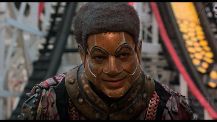 The Wiz is presented in the aspect ratio of 1.85:1. Approved by producer Rob Cohen, this new 4K restoration was undertaken by Universal Pictures and created from the 35 mm original camera negative. The Dolby Atmos soundtrack, also approved by Cohen, was remastered from the original one-inch eight-track stereo music masters. two-inch twenty-four-track original music recordings, and the 35 mm mag stems held in the Universal Pictures vault. The feature is presented in Dolby Vision HDR (high dynamic range) on the 4K Ultra HD disc and high definition SDR (standard dynamic range) on the Blu-ray. Image restoration and audio mixing and restoration: NBC Universal StudioPost.This is a significant improvement over the old Universal 1080 release, even on the 1080 disc included in this set, let alone the 4K UHD version. The first thing anyone who has the Universal disc is going to notice is a pretty radically different overall color temperature. Just compare screenshot 1 of my old Universal review with screenshot 1 of this review and you'll get an eyeful. While that particular segment is a bit more buttery and yellow in this version, that's not to suggest the entire transfer looks that way, and in fact the Dolby Vision and HDR grades may tend to offer the most "oomph" in terms of tones in the red, blue and purple areas. The opening still looks just a tad dowdy, if decidedly better than on the old Universal disc, but things really start popping more noticeably once Dorothy takes her little cyclone ride. Detail levels show at least marginal improvements over the Universal release when comparing 1080 to 1080, but fine detail definitely sees some upticks in the 4K presentation, to the point that you can actually pretty easily discern where makeup or prosthetics end and actual faces begin in some close-ups. This is another 4K presentation where the generally tightly resolved 1080 grain field can take on new texture and grittiness, which may not be everyone's cup of tea, so to speak. I noticed no age related wear and tear of any import on either presentation.