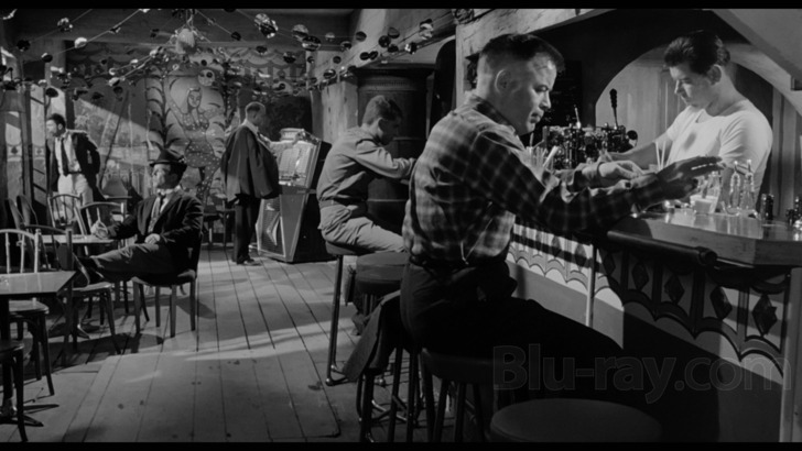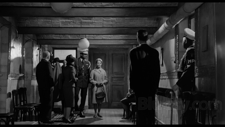 One look at these direct-from-disc screenshots reveals that Town Without Pity clearly improves upon the older DVD edition (he says, damning with faint praise), but it's still far from a pristine presentation and was clearly sourced from an older master. The black-and-white image is mostly uneven, occasionally veering wildly into softness and never truly achieving the kind of tack-sharp clarity you might expect from this filmed production even under the most ideal lighting conditions. Dirt and debris are likewise present here and there although the (clearly not first-gen) source material isn't exceedingly dirty, with other distractions arriving in the form of occasional telecine wobble, slight ringing, and obviously a certain amount of grain management (or a source-related lack of grain), as the entire image has a slightly smooth and vaguely processed appearance. That said, it's still quite watchable on the whole and thus far from a disaster, sitting comfortably in that average middle ground where it'll likely look good enough on most small to medium-sized displays. So yes, Town Without Pity obviously shows room for visual improvement... but it could be much worse.