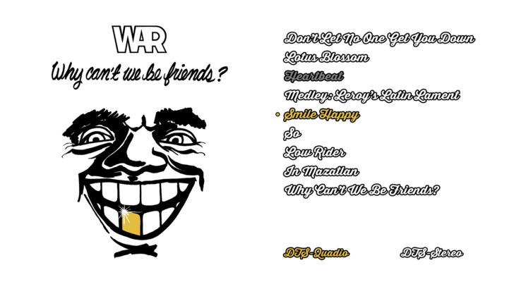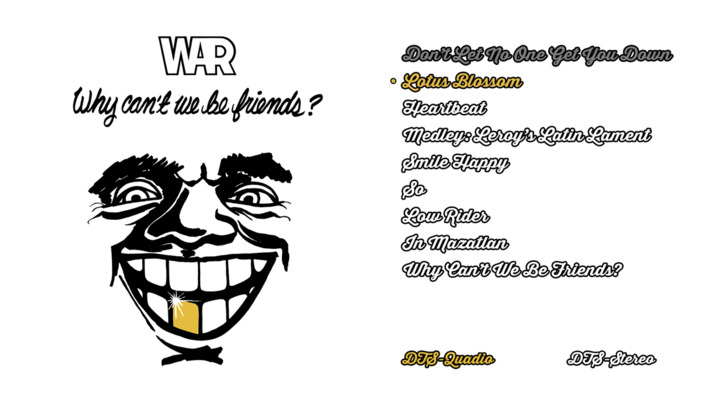 War: Why Can't We Be Friends? features DTS-HD Master Audio 4.0 and DTS-HD Master Audio 2.0 options. As with all of the other Quadio releases in this particular batch, engagement of the rear speakers is immediate, with the evocative guitar chords that begin Don't Let No One Get You Down. Then when the rest of the instruments and notably the percussion and vocals enter, suddenly the entire soundstage is alive and immersive. Lotus Blossom provides some nice examples of directionality, with the Rhodes (with a Leslie effect) wafting in the front, and organ and guitar from the rear. Hearbeat has some fun rhythm guitar erupting from the front right speaker while the funky bass attacks from the rear. The percussion in this song is particularly effective and immersive. The album's hit title song offers great separation, with voices in the front and the propulsive rhythm accompaniment from the rear.