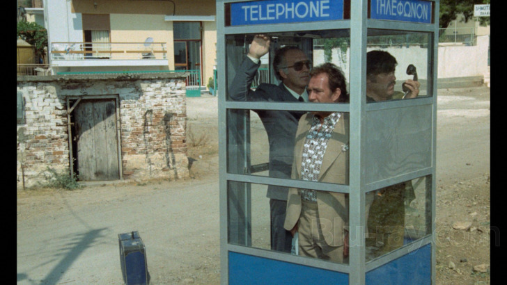 The commentary by Travis Woods included on this disc as a supplement mentions how eerily prescient Weak Spot may seem for some, especially those reeling from a certain recent election outcome, but certain aspects of the plot of this film are more than redolent of times past, as indicated by "historical" efforts like Franz Kafka's The Trial, among many other potential examples that could be cited. Weak Spot begins with a bang, or perhaps more appropriately a splat, as director Peter Fleischmann's framings show a police action resulting in a suicidal jump from a building. Fascinatingly, the mise-en-scène soon seems to be "withdrawing" from this scene as the camera pulls back, but that's a sleight of hand that instead allusively introduces the film's focal character, a travel agent identified in the cast listing as Georgis (Ugo Tognazzi), but who for all intents and purposes is "nameless" (a key subtextual plot point), and who works across the street from the maelstrom. Why introduce a character this way, with an apparently unrelated and chaotic situation unfolding outside of his workplace? That's just one of several puzzles a labyrinthine and probably intentionally opaque screenplay offers, but this opening gambit does two things almost instantly: it seems to indicate an out of control police state (something the rest of the film certainly emphasizes), and it also unavoidably sets things off in an emotionally roiling, skewed manner, that probably presages the emotional turmoil that Georgis is about to experience.