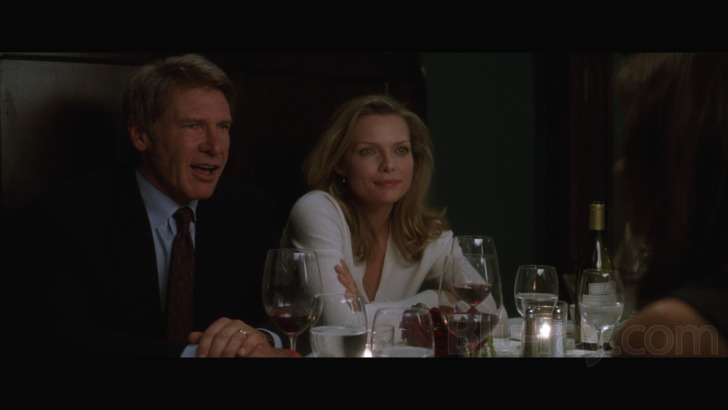 While I don't own the 2021 Paramount Blu-ray Marty reviewed, it sounds like it's based on the same master that appeared on the 2000 DreamWorks DVD with some noise reduction and sharpening applied. The SD transfer displays some dust as well as black and white specks that pop up periodically throughout. I have assembled a graphical comparison between the UHD disc and the DVD with frames that match as close as I could obtain. While several of the specks are quite small, they are present. There's a larger white speck below the collar of Dr. Norman Spencer's (Harrison Ford) dress shirt in Screenshot #38. Fortunately, these dust specks are absent on Scream's transfers. The DreamWorks DVD is interlaced because combing is evident alongside Claire (Michelle Pfeiffer) in frame grab #20 where she rushes to the bathroom to prepare for a dinner date. The digital colorist has corrected skin tones on the recent transfers. For instance, Norman's face (particularly his forehead, nose, and cheeks) has a somewhat ruddy complexion (e.g., #16) on the SD image. This has been replaced with a more natural skin tone (e.g., see #17). In addition, Claire's face has a reddish/pink complexion on the DVD (#26) and Scream's Blu-ray (#27), but it receives a more subdued and neutral tone on the UHD (#28).
