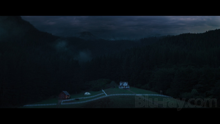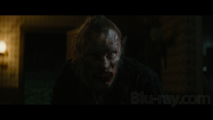 Wolf Man is a dark film. Even during daytime shots, the skies are typically overcast, and in the forest, due to the height and density of the tree cover, even if it were properly sunny, the shots in the wooded environment where a number of scenes are set would retain a certain amount of gloom. The same holds true once the family arrives at Blake's father's home. It's rooms are universally poorly and dimly lit, infected with a level of dirt and grime that are reflective of the space of a man living too long alone and away from the rest of society. As such, the darkness crafted by deep black levels is the most significant hurdle for the 1080p presentation to overcome. However, even in gloomy daytime scenes set in the woods, blacks can crush details in darker and shadowy elements. The same holds true in the dimly lit interiors of the home or the exterior nighttime shots as Blake, Charlotte, and Ginger fight for their lives. Given the fact that the film generally features a muted color palette, primaries don't often have opportunities to pop, but occasionally reds or yellows will spring up when given the chance. Fine detail is generally very high, with facial and costuming particulars being discernable. Most importantly, the high level of fine detail allows viewers to properly investigate and appreciate the numerous practical creature effects that are frequently on display during Blake's lengthy transformation and represent the one of the film's greatest strengths. The transfer is clean and devoid of banding, noise, and damage.