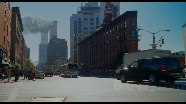 The separation in image quality between the 2006 Paramount transfer and this year's Shout presentations can really only be in noticed in full when you watch you watch the discs in motion (and on a large screen). Shout's standard 1080p Blu-ray is actually a shade brighter than Paramount's Blu. There are very few print flaws on the Shout. The only one I could spot is a thin, light scratch you can see going down the right side of Officer Colovito's (Nicholas Turturro) nose in frame grabs 26-28. (It dates back to the master used on the Paramount discs in '06.) McGarvey says in the AC interview that he didn't incorporate much grain, particularly for the rubble scenes. But when it's present, you'll notice it on both the UHD and Blu-ray.