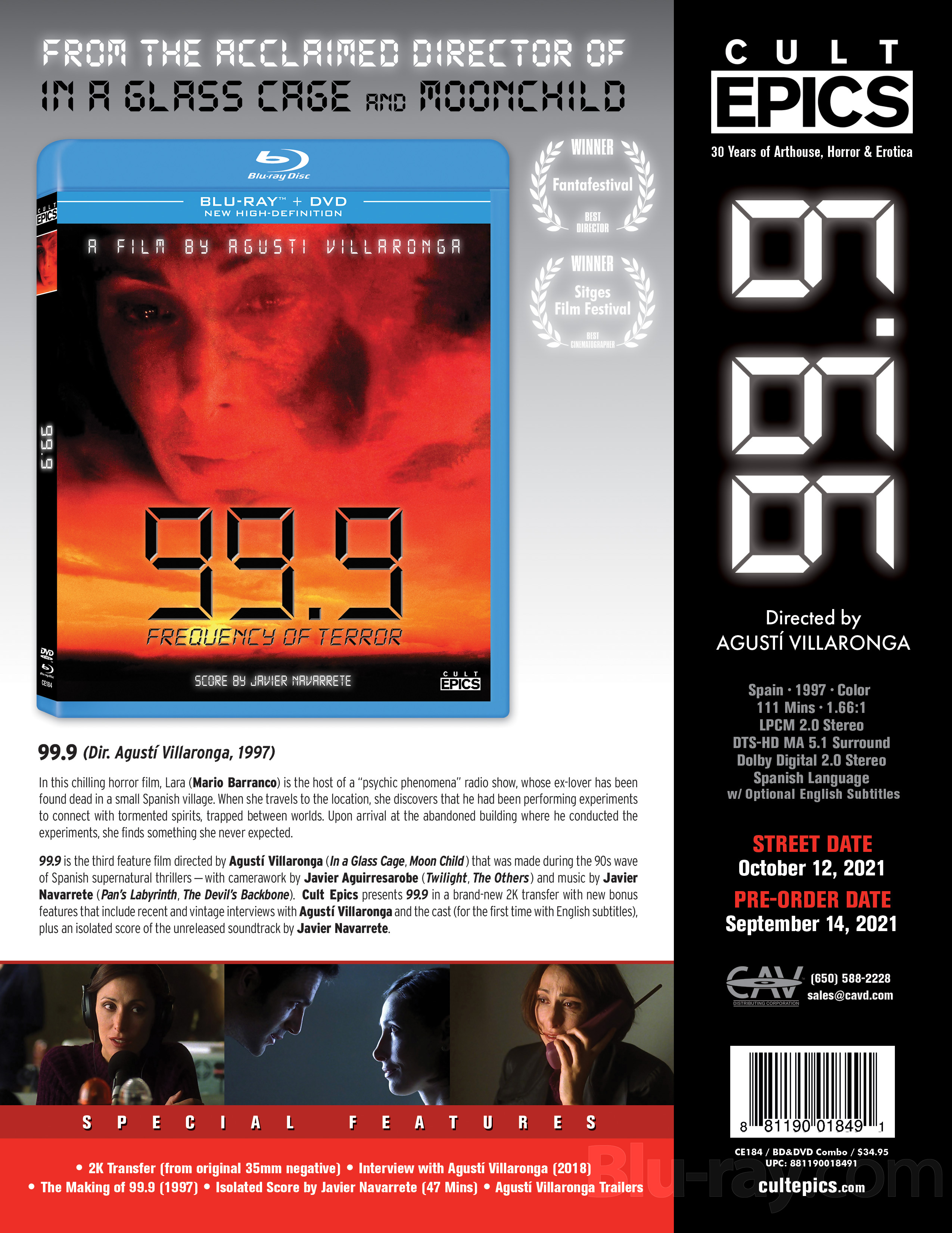 99.9 (1997), starring María Barranco, Terele Pávez, Ruth Gabriel, Ángel de Andrés López, and Gustavo Salmerón. The release will be available for purchase on October 12.