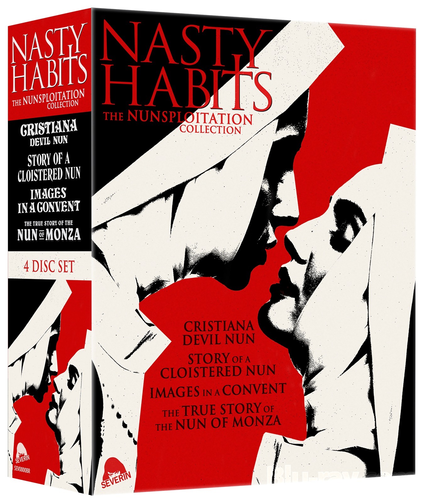 Label description: Throughout the '70s, Italian filmmakers fired a canon of blasphemy to launch what remains the most controversial genre of all. Partake of its unholy sacrament with these four uncut/uncensored Nunsploitation classics: In Sergio Bergonzelli's CRISTIANA DEVIL NUN – here in two extreme versions – a born-again nymphomaniac finds pleasures of the flesh in a convent of the damned. Suzy Kendall and Eleonora Giorgi star in Domenico Paolella's historically accurate and wholly amoral STORY OF A CLOISTERED NUN. Sleaze maestro Joe D'Amato combines Sapphic lust, Satanic panic and pure filth for IMAGES IN A CONVENT. And with THE TRUE STORY OF THE NUN OF MONZA, director Bruno Mattei fulfills ungodly vows of graphic sacrilege. Severin Films proudly presents this superfluity of depravity, each mastered with all-new Special Features produced exclusively for this collection.