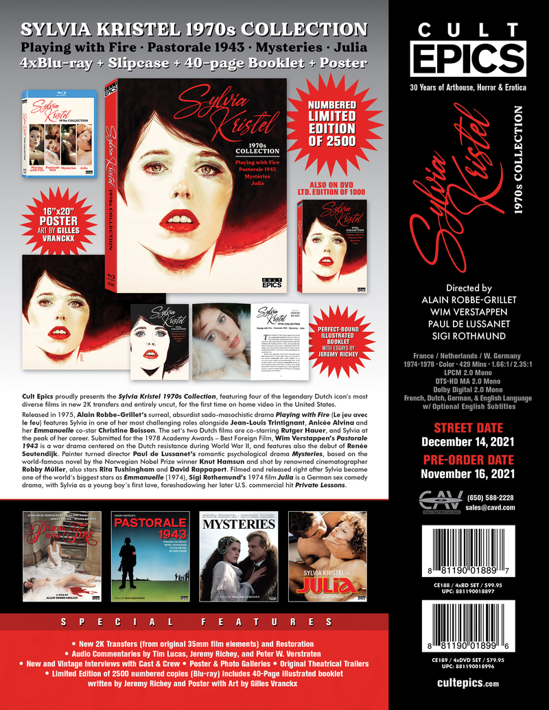 Label description: Cult Epics proudly presents the Sylvia Kristel 1970s Collection, featuring four of the legendary Dutch icon's most diverse films in new 2K transfers and entirely uncut, for the first time on home video in the United States.