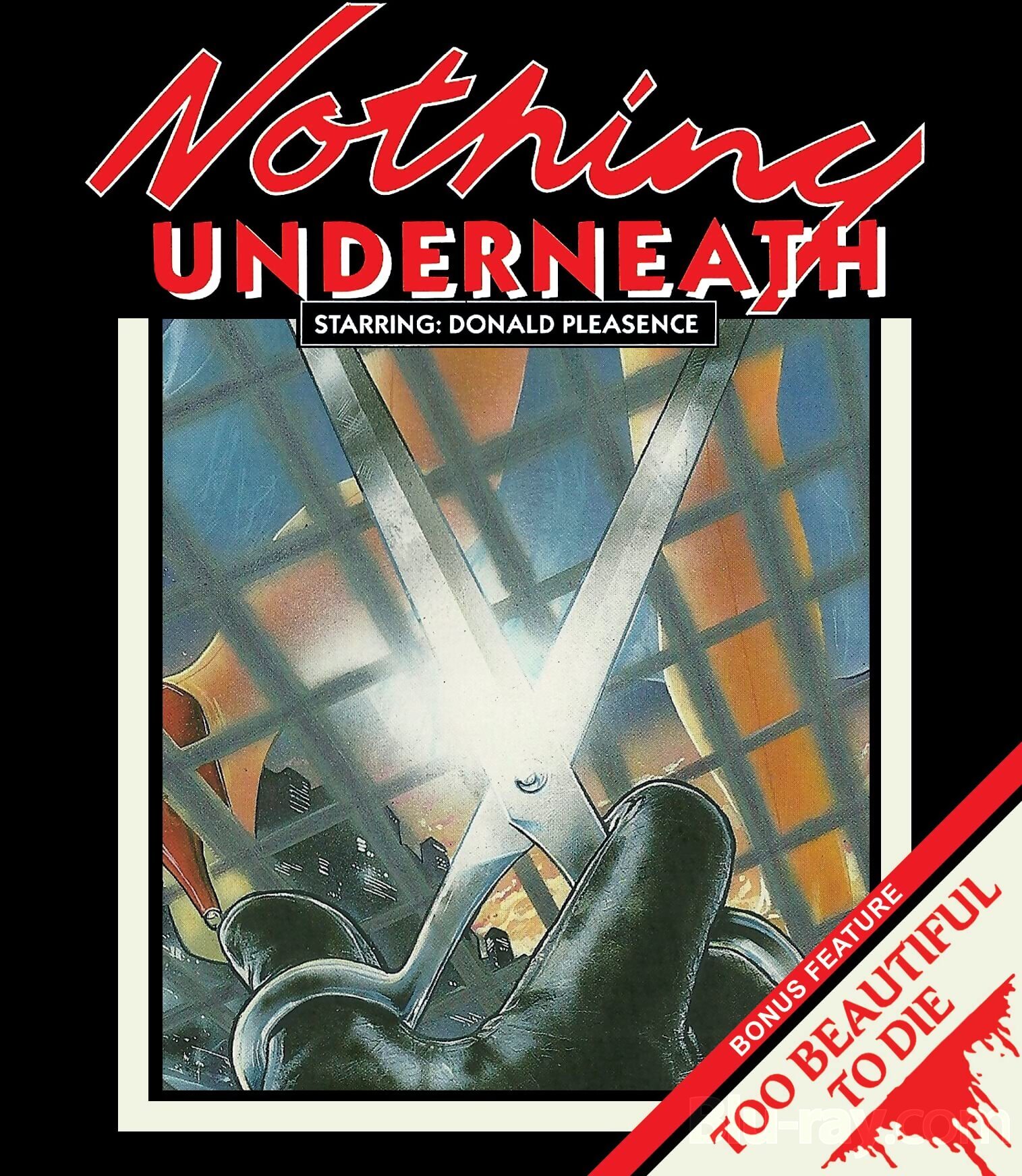 Synopsis: Bob Crane has long maintained a psychic connection to his twin sister, Jessica, who works as a fashion model in Milan. When Bob senses that his sister might be injured or killed, he travels to Italy to look for her, only to discover that she's vanished without a trace. Enlisting the help of about-to-retire Commissioner Danesi, Bob soon finds himself embroiled in a web of mystery and terror, when a scissors wielding killer begins to strike and all clues lead back to Jessica... A highly entertaining and unexpectedly raunchy late period giallo, clearly taking a cue from the American slasher craze, Carlo Vanzina's NOTHING UNDERNEATH amps up its mid 80s stylings and stars prolific TV actor Tom Schanley (Dexter), Danish fashion model Renée Simonsen, and Donald Pleasence (Halloween) and features a lush score by Pino Donaggio (Dressed to Kill).