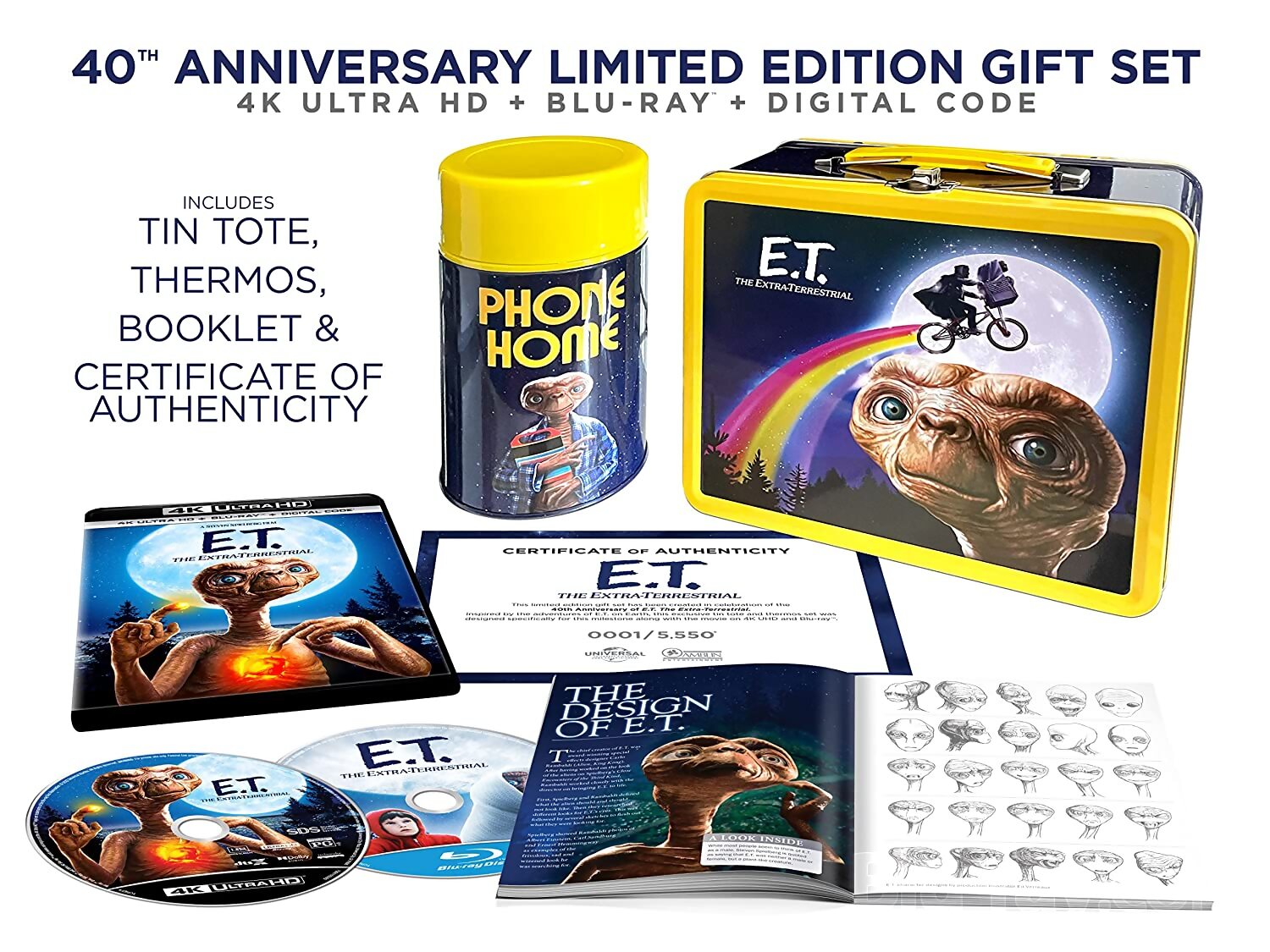 - E.T. THE EXTRA-TERRESTRIAL 40TH ANNIVERSARY LIMITED EDITION GIFT SET (4K Blu-ray + Blu-ray™ + Digital): Includes movie, collectible tin tote, thermos, booklet and certificate of authenticity (Amazon Exclusive)