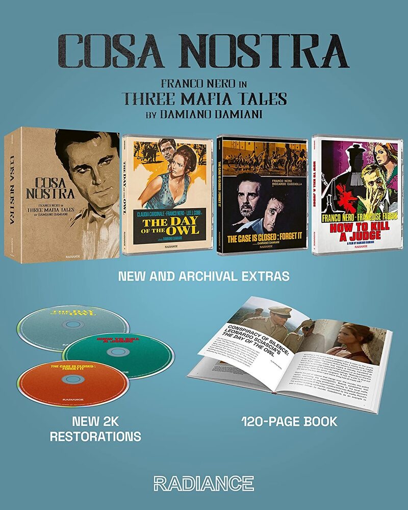 - Limited edition 120-page book featuring new and archival writing on the films by experts on the genre including Andrew Nette on Leonardo Sciascia's The Day of the Owl; Piero Garofalo on The Case is Closed: Forget It; Paul A. J. Lewis on depictions of the mafia in each of the films within this set; Shelley O'Brien on each of the scores; a newly translated archival interview with Damiani; Nathaniel Thompson on Franco Nero; Marco Natoli on Damiani's place within the cinema politico movement in Italian cinema; a critical overview for each the films by Cullen Gallagher and credits for each film