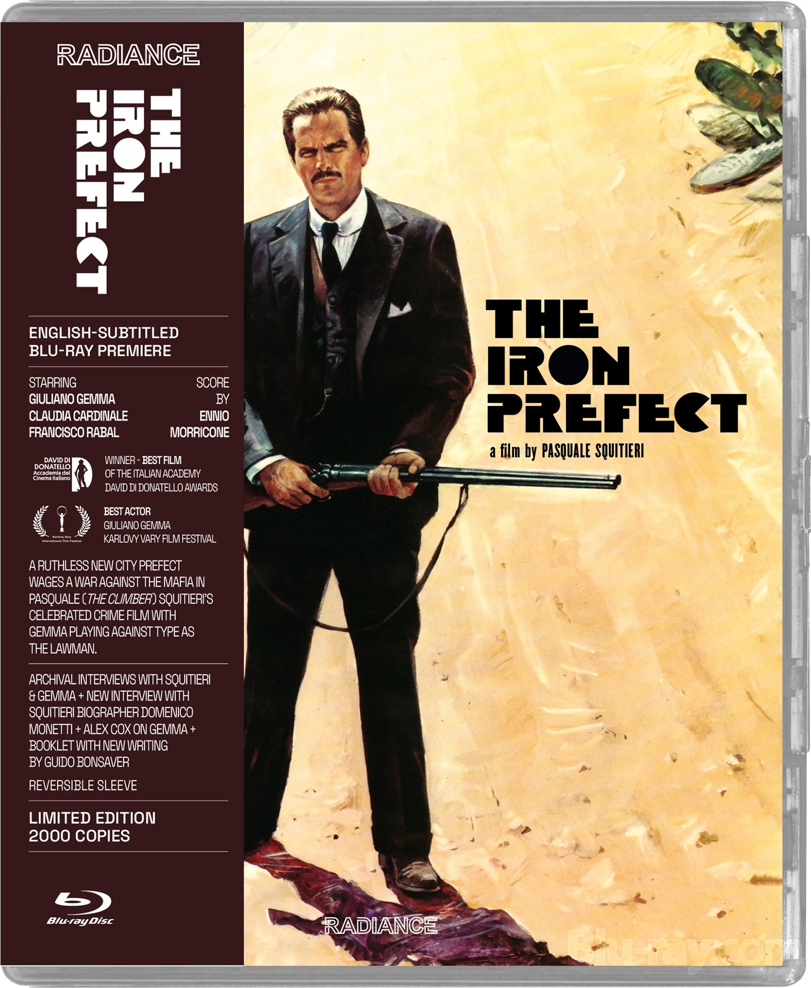 Description: Based on the true story of the Iron Prefect, Cesare Mori, who was sent to Sicily for an Eliot Ness-in-The Untouchables style clean up of the mafia. Mori approaches organised crime on the island with uncompromising force even in the face of mass murders designed to scare him off. Pasquale Squitieri (The Climber) directs this stunning period piece which won the David di Donatello award for best film and features spaghetti western icon Giuliano Gemma brilliantly playing against type as the titular hero, winning him an award for his performance at the prestigious Karlovy Vary Film Festival. Alongside Gemma are the cream of international film from the period with co-stars Claudia Cardinale (The Day of the Owl) and Francisco Rabal (Sorcerer), the key surveyor of Italy's civic cinema screenwriter Ugo Pirro (The Working Class Goes to Heaven) and legendary composer Ennio Morricone (Once Upon a Time in America).