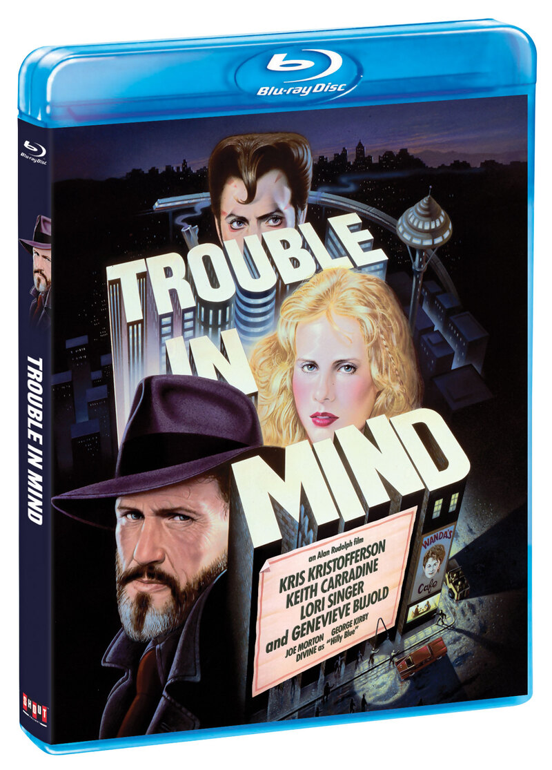 Label description: In the fictional and hypnotic Rain City, ex-cop Hawk (Kris Kristofferson) has just been released from prison after serving hard time for killing a man. Meanwhile, a young, down-on-his-luck father, Coop (Keith Carradine), and his radiant, innocent wife, Georgia (Lori Singer), head toward the city with their new baby in search of a new life. Littered with eccentric gangsters and thugs, Rain City almost serves as a side street to human evolution. At the center of it all is Wanda's – a dive diner run by Hawk's ex (Geneviève Bujold) – where the characters' lives will intersect, changing them forever. Written and directed by Alan Rudolph, Trouble In Mind is set somewhere in the future and the past of countless classic film noirs, creating a completely realized neo-noir masterpiece.