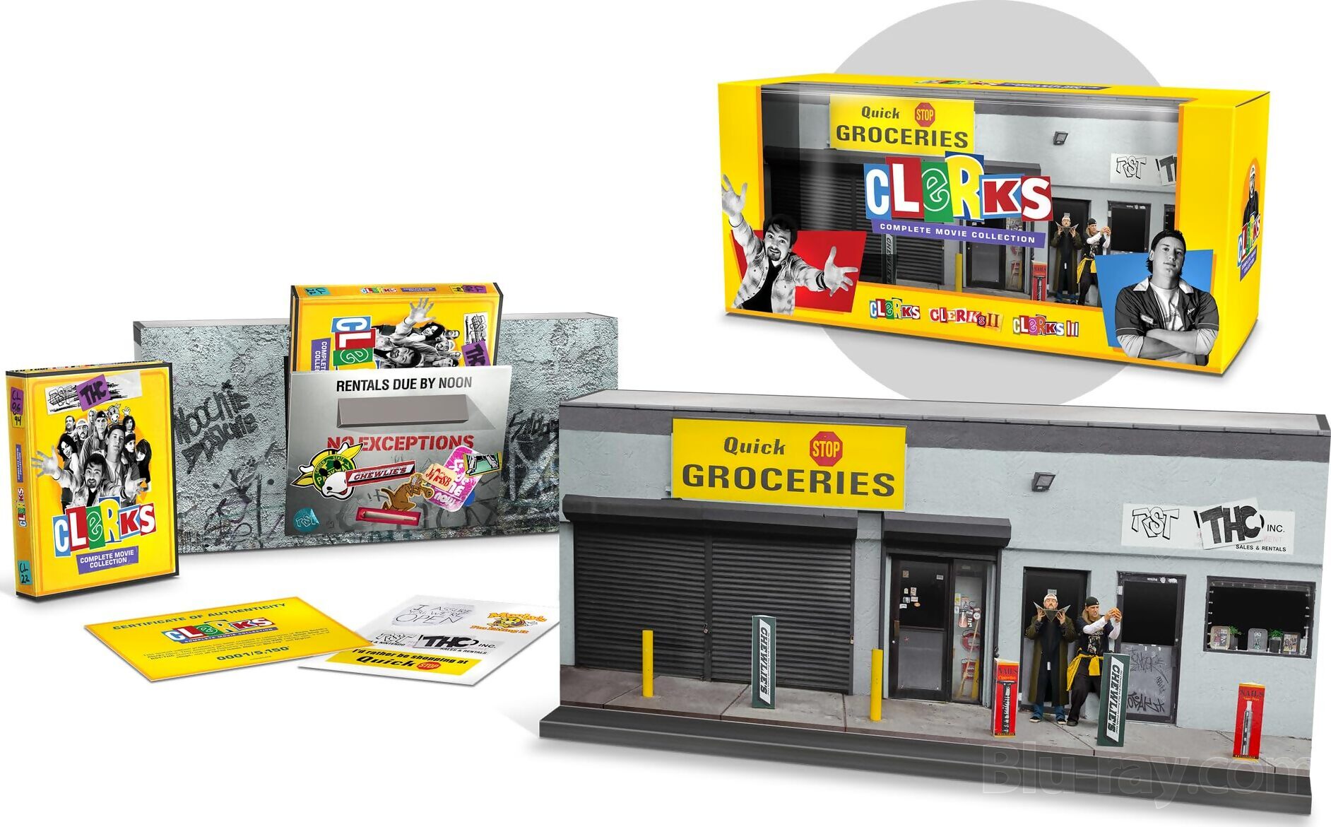 Studio descirption: Get ready for a shift-load of fun! This limited-edition set holds all three Clerks films on Blu-ray and Digital in a 3D miniature of the iconic Quick Stop and RST Video storefronts. The package also features a working VHS return slot, so you can safely store the discs without running up late fees. Feel free to vandalize the rental-return "wall" using the included set of cling stickers, featuring in-world business logos and IYKYK jokes from the franchise. Follow your favorite Gen-X icons as they go from jaded, disenfranchised store clerks in Clerks through their three-decade journey to small business owners in Clerks III, balancing rooftop roller hockey with the absurdities of work and life.