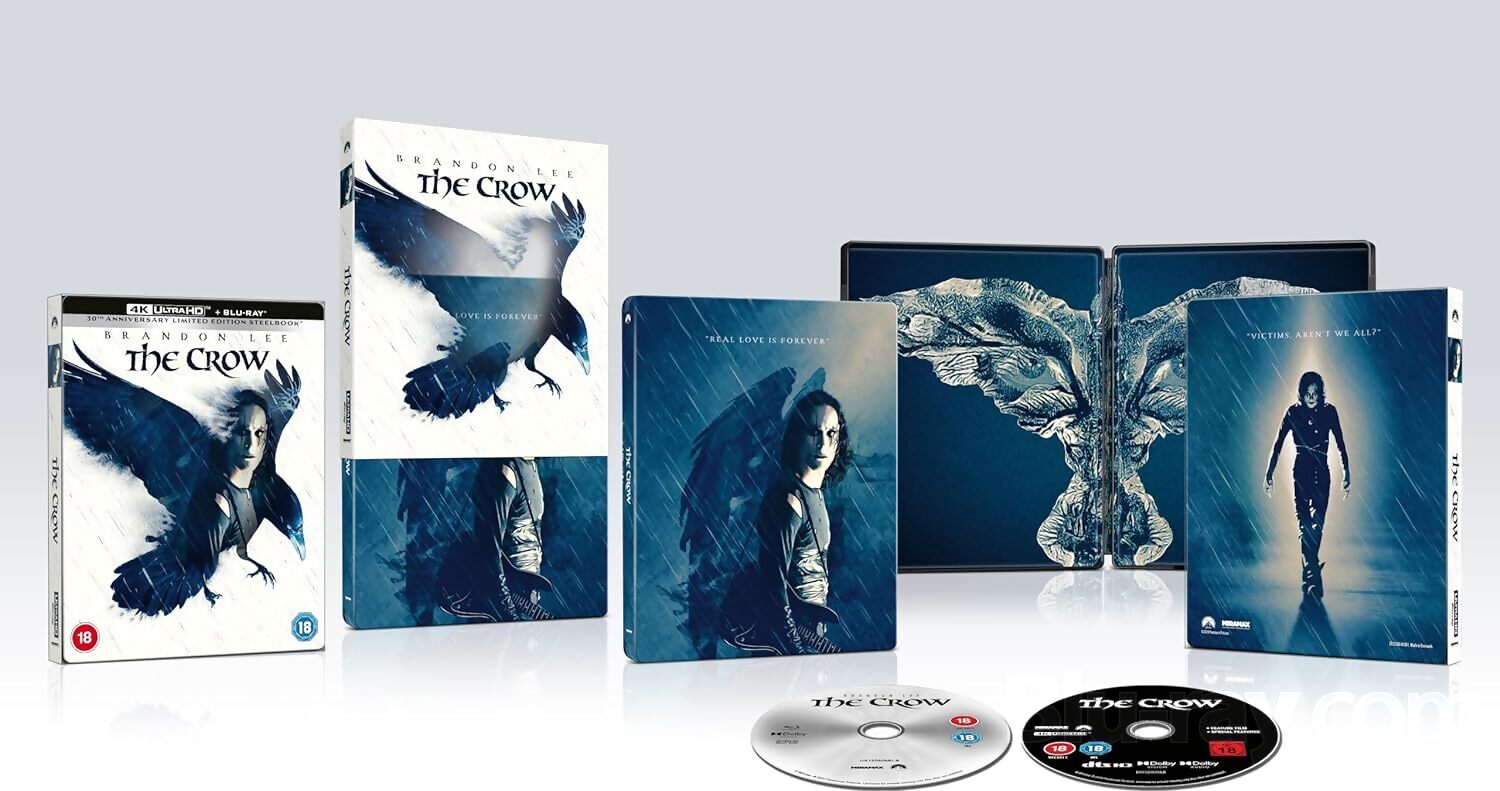 Description: Newly remastered, THE CROW will be available on 4K Blu-ray with new and legacy bonus content included within two limited-edition SteelBooks. The SteelBooks include both 4K Blu-ray and Blu-ray discs, with one featuring an o-ring with a cutout of a crow that lifts to reveal a portrait of Brandon Lee with his guitar, whilst the other features an o-ring with a cutout of a crow that lifts to reveal the face of Brandon Lee. It will also be available as a standard 4K Blu-ray release.