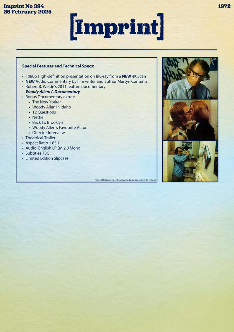 Woody Allen and Diane Keaton's long-term collaboration began here, a comedy following a recently divorced film critic who sees apparitions of Humphrey Bogart's Casablanca character Rick Blaine. Includes Robert B. Weide's 2011 feature documentary Woody Allen: A Documentary, plus a brand NEW Audio Commentary by film writer & author Martyn Conterio.
