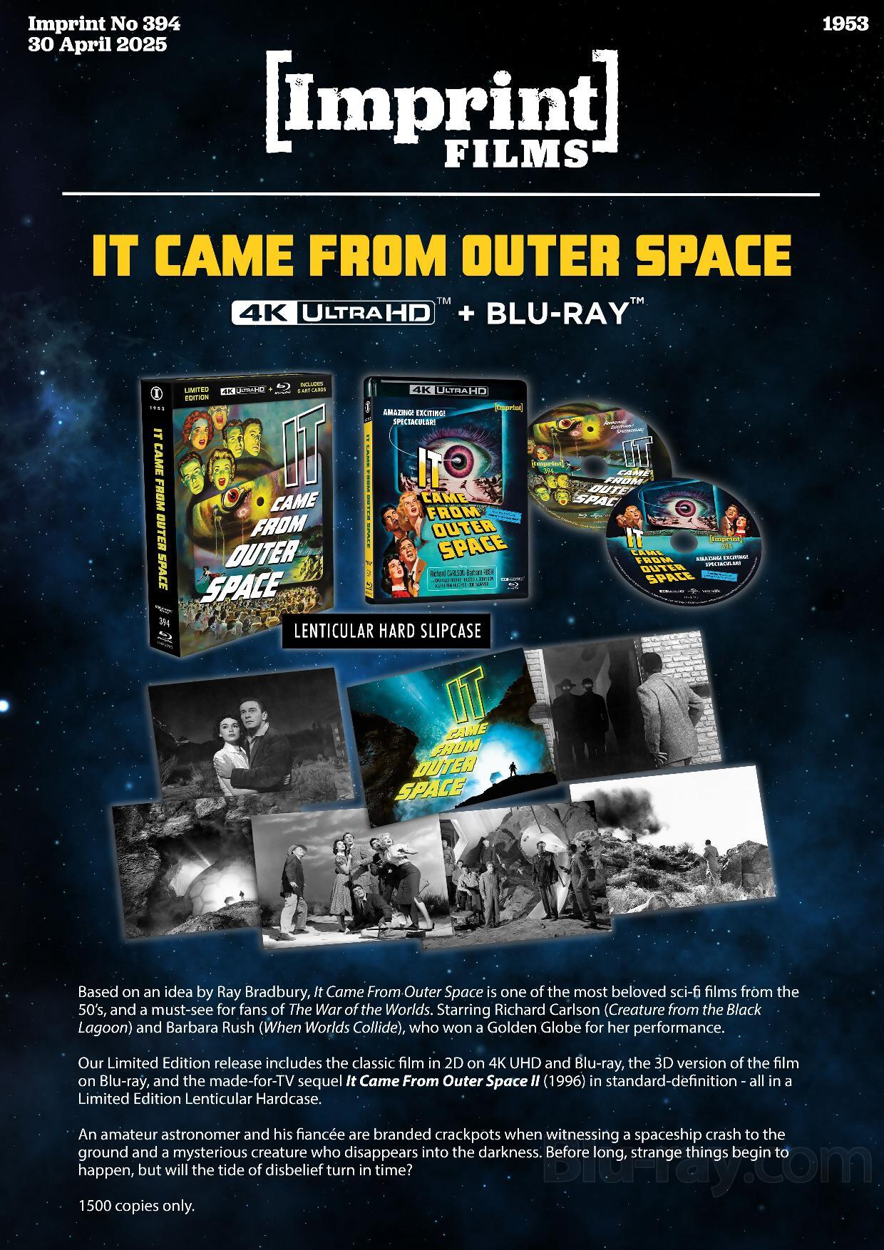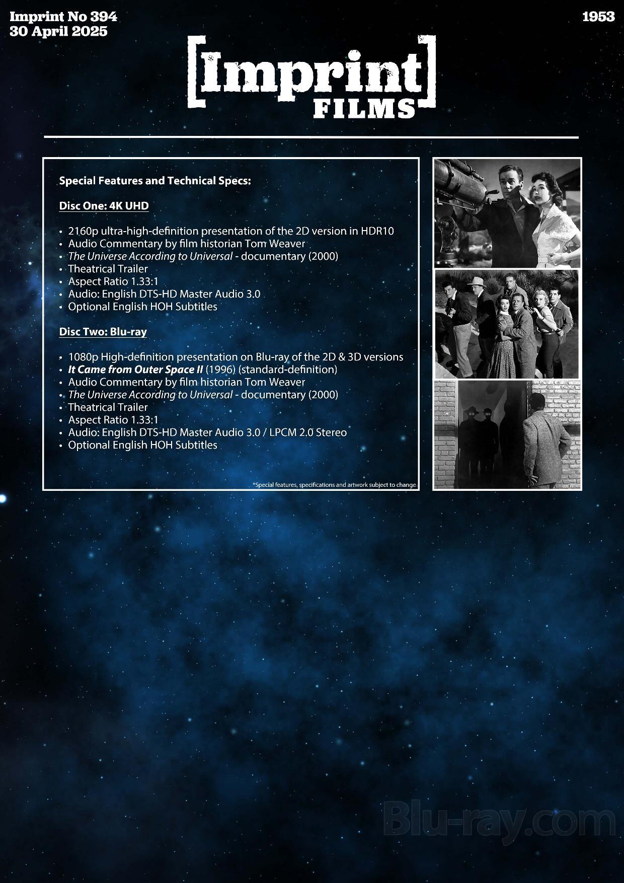 Our Limited Edition release includes the classic film in 2D on 4K Blu-ray and Blu-ray, the 3D version of the film on Blu-ray, and the made-for-TV sequel It Came From Outer Space II (1996) in standard-definition - all in a Limited Edition Lenticular Hardcase.
