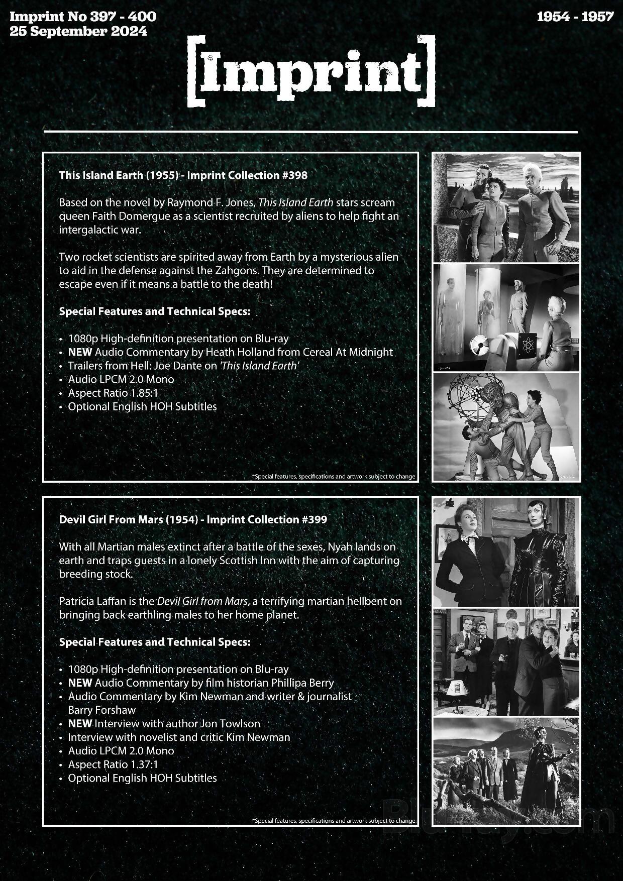 Includes a brand NEW Audio Commentary by Heath Holland (Cereal At Midnight) on This Island Earth, and a brand NEW Audio Commentary (Kim Newman and Barry Forshaw) & Interview (author Jon Towlson) on Devil Girl From Mars.