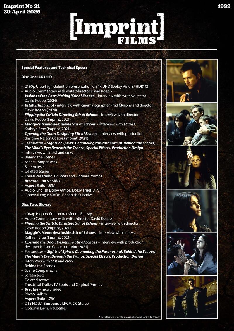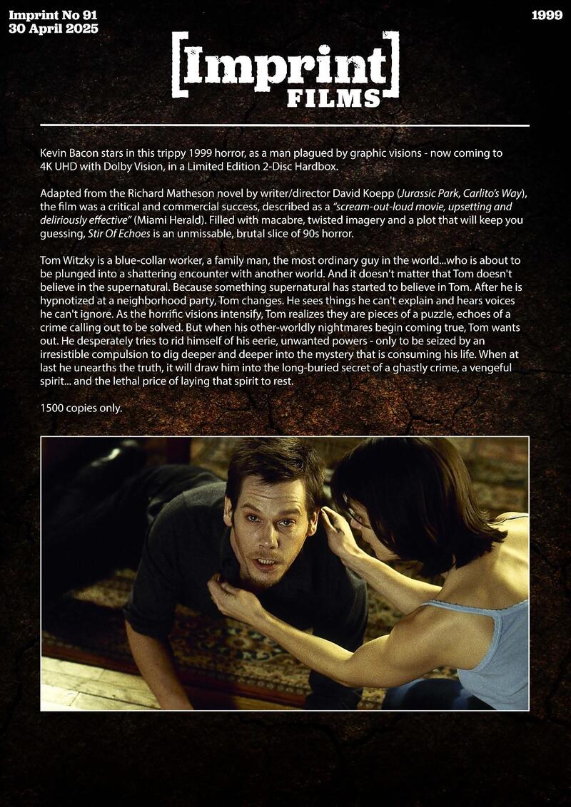 Stir of Echoes (1999), starring Kevin Bacon, Kathryn Erbe, Illeana Douglas, Liza Weil, and Kevin Dunn. The release is scheduled to arrive on the market on April 30.