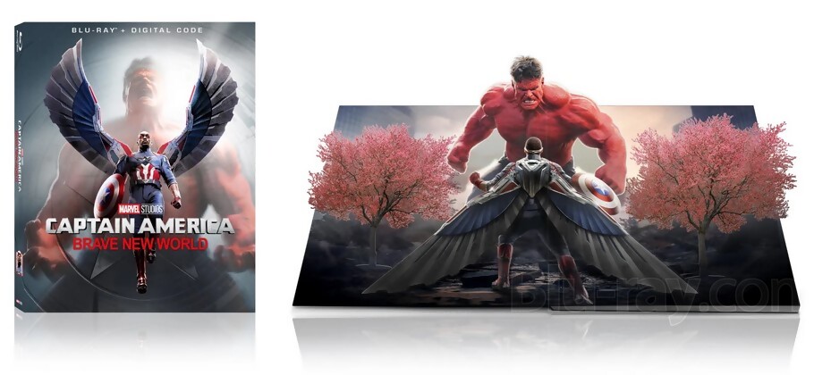 *Walmart will have available for purchase an exclusive pop-up Blu-ray that unfolds into a stunning 3D scene featuring Captain America facing off against Red Hulk. With intricate details like Sam's spread wings, and iconic shield, the dynamic display creates a collectible showdown making it a must-have for Marvel fans.