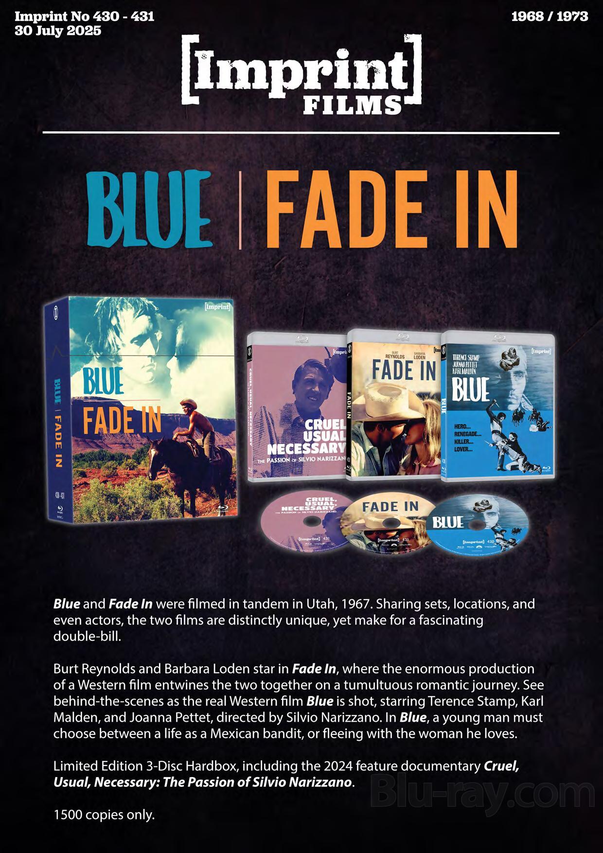 Burt Reynolds and Barbara Loden star in Fade In, where the enormous production of a Western film entwines the two together on a tumultuous romantic journey. See behind-the-scenes as the real Western film Blue is shot, starring Terence Stamp, Karl Malden, and Joanna Pettet, directed by Silvio Narizzano, and making its worldwide Blu-ray debut!