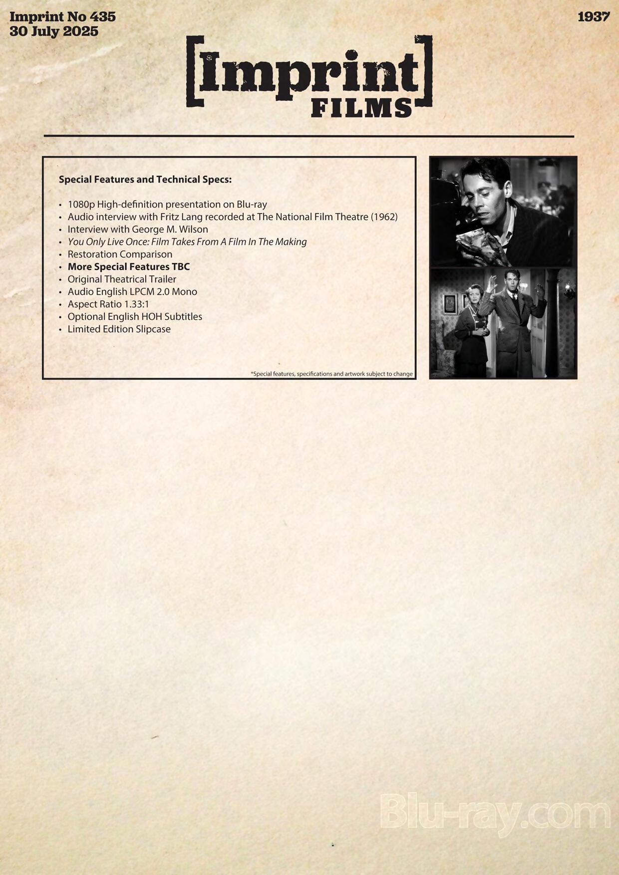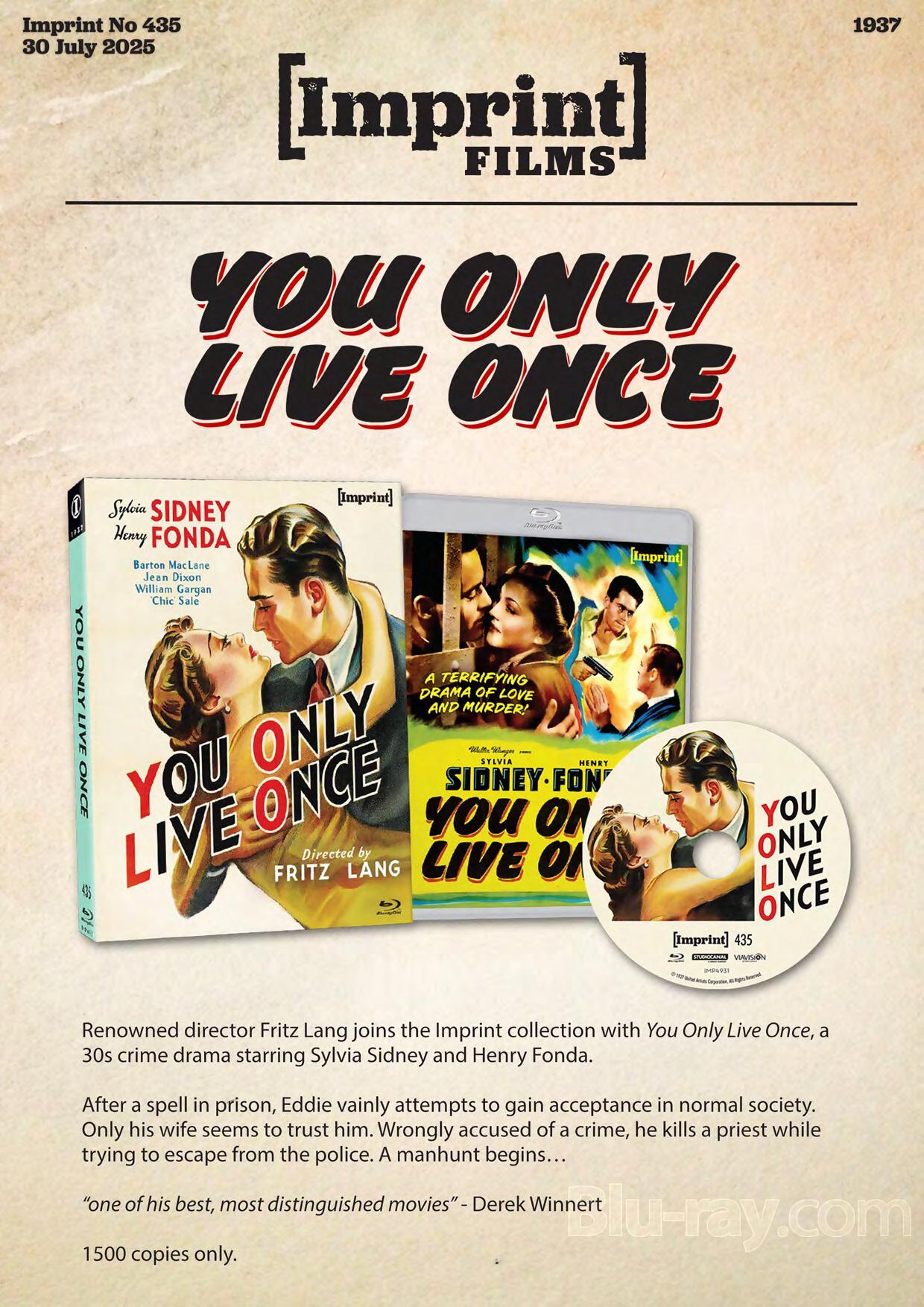 Renowned director Fritz Lang joins the Imprint collection with You Only Live Once, a 30s crime drama starring Sylvia Sidney and Henry Fonda.