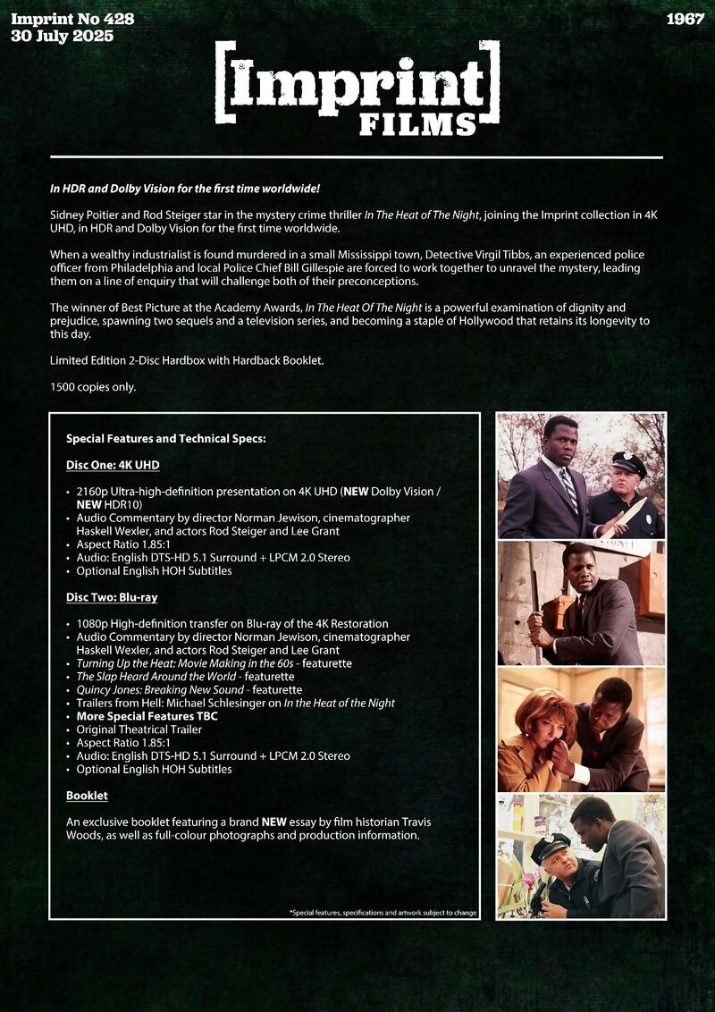 In HDR and Dolby Vision for the first time worldwide! Sidney Poitier and Rod Steiger star in the mystery crime thriller In The Heat of The Night, joining the Imprint collection in 4K Blu-ray with Dolby Vision.