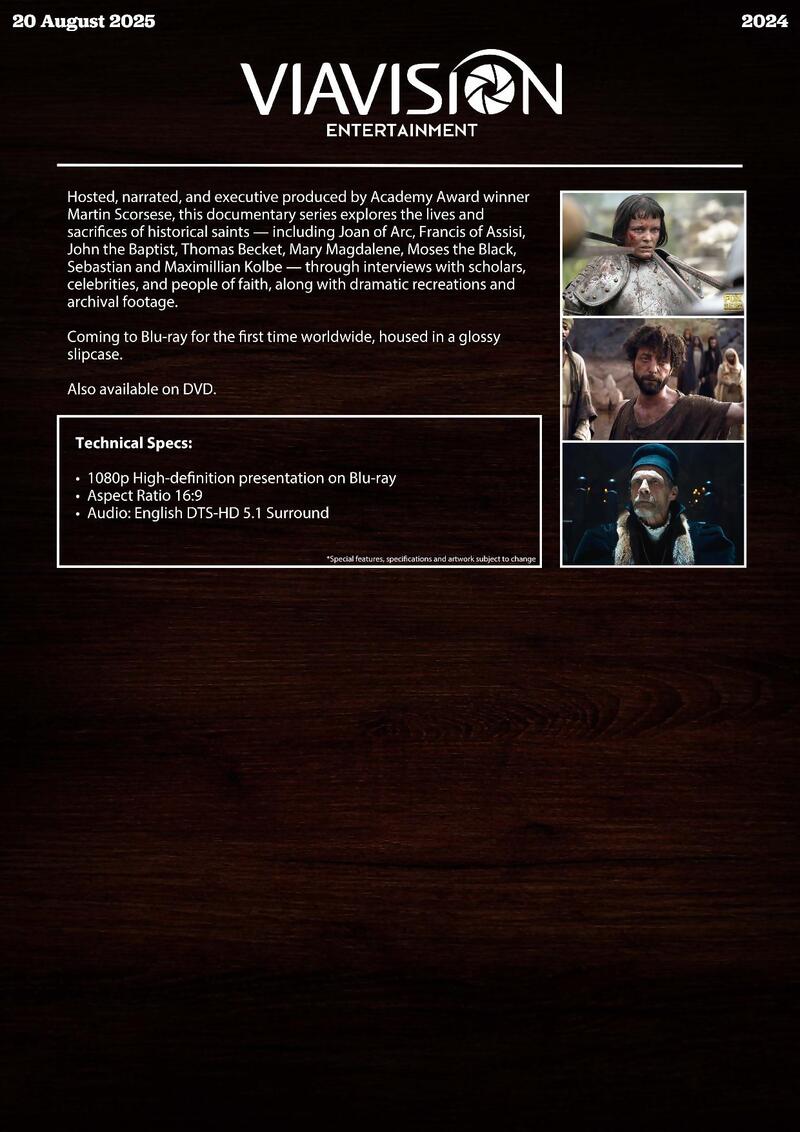 Description: Hosted, narrated, and executive produced by Academy Award winner Martin Scorsese, this documentary series explores the lives and sacrifices of historical saints — including Joan of Arc, Francis of Assisi, John the Baptist, Thomas Becket, Mary Magdalene, Moses the Black, Sebastian and Maximillian Kolbe — through interviews with scholars, celebrities, and people of faith, along with dramatic recreations and archival footage.