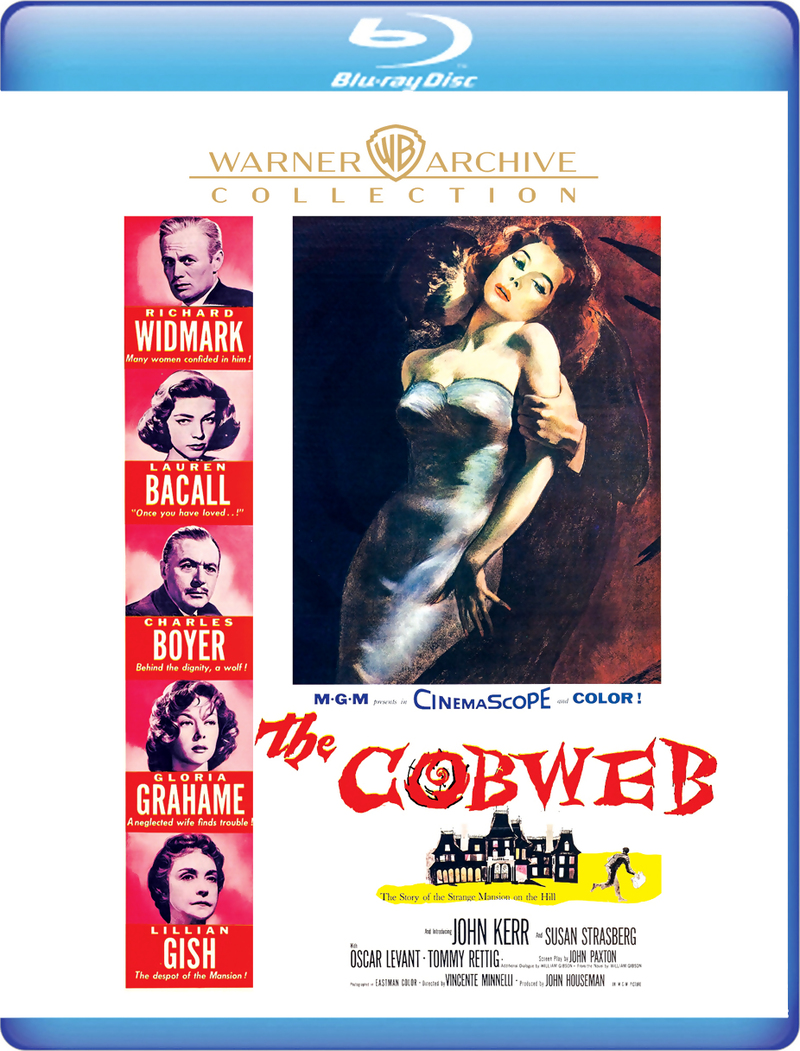 Step inside "the Castle," a large private psychiatric facility. Here, Dr. Stewart McIver (Richard Widmark) devotes night and day to his profession while neglecting his pining, voluptuous wife (Gloria Grahame). A colleague (Charles Boyer) with a fondness for booze and a pretty face seeks to comfort the wife. Now add Lauren Bacall, Lillian Gish, John Kerr, Susan Strasberg, Oscar Levant and subplots of love, life and derangement and you have the entanglements of The Cobweb. Some critics gleefully skewered the film's labored storyline about patient involvement in the choice of library draperies, but pay no heed. With its top cast and Vincente Minnelli's command of color and melodrama, this film is popcorn for fans of soaps.