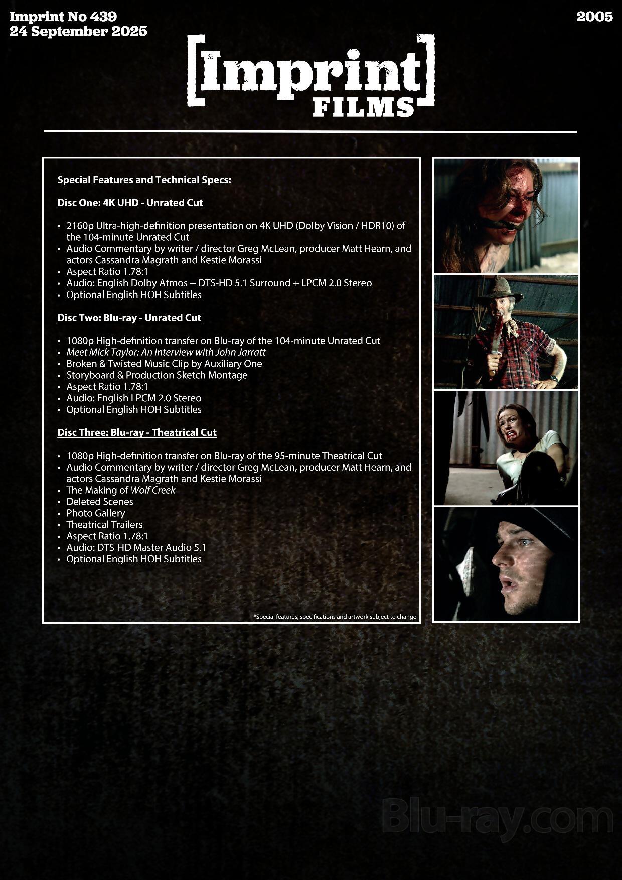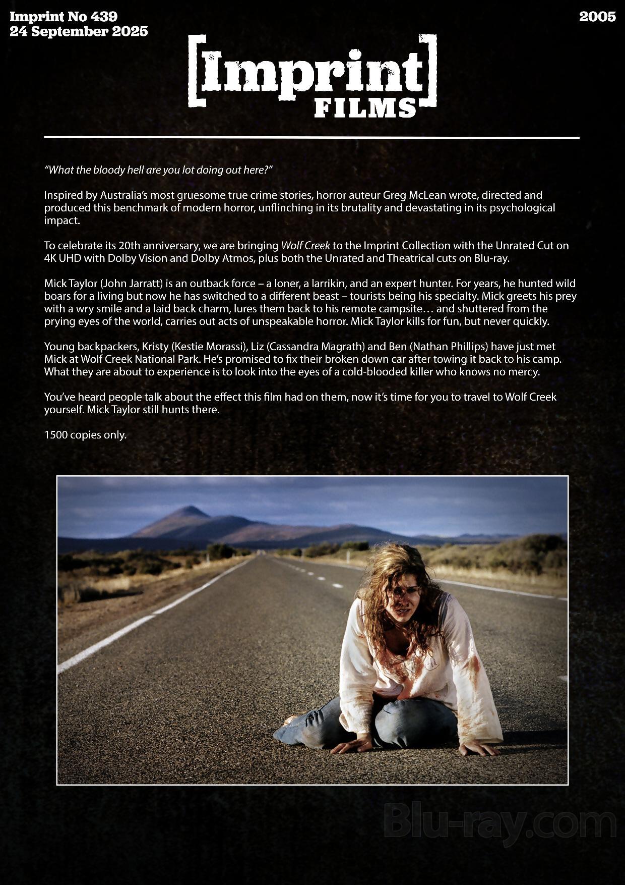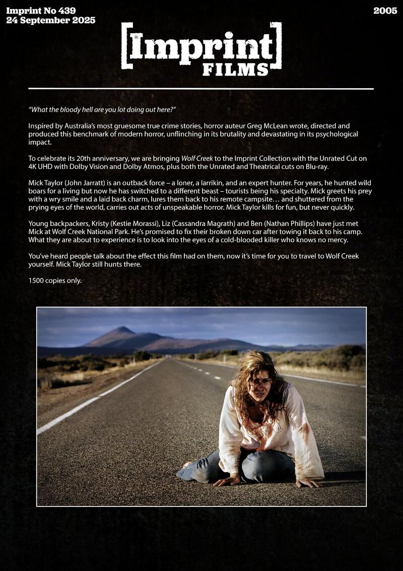 To celebrate its 20th anniversary, we are bringing Wolf Creek to the Imprint collection with the Unrated Cut on 4K Blu-ray with Dolby Vision and Dolby Atmos, plus both the Unrated and Theatrical cuts on Blu-ray.